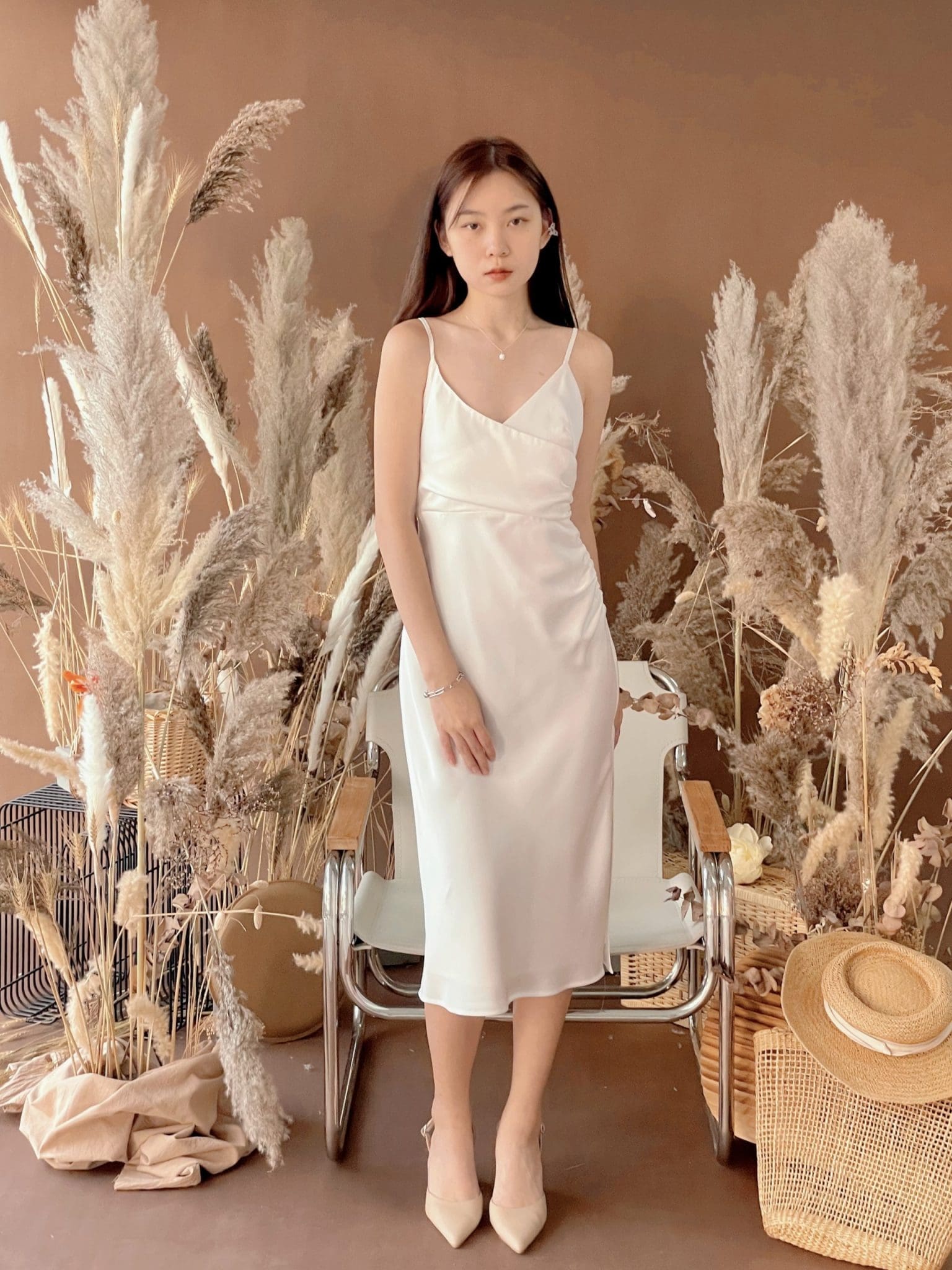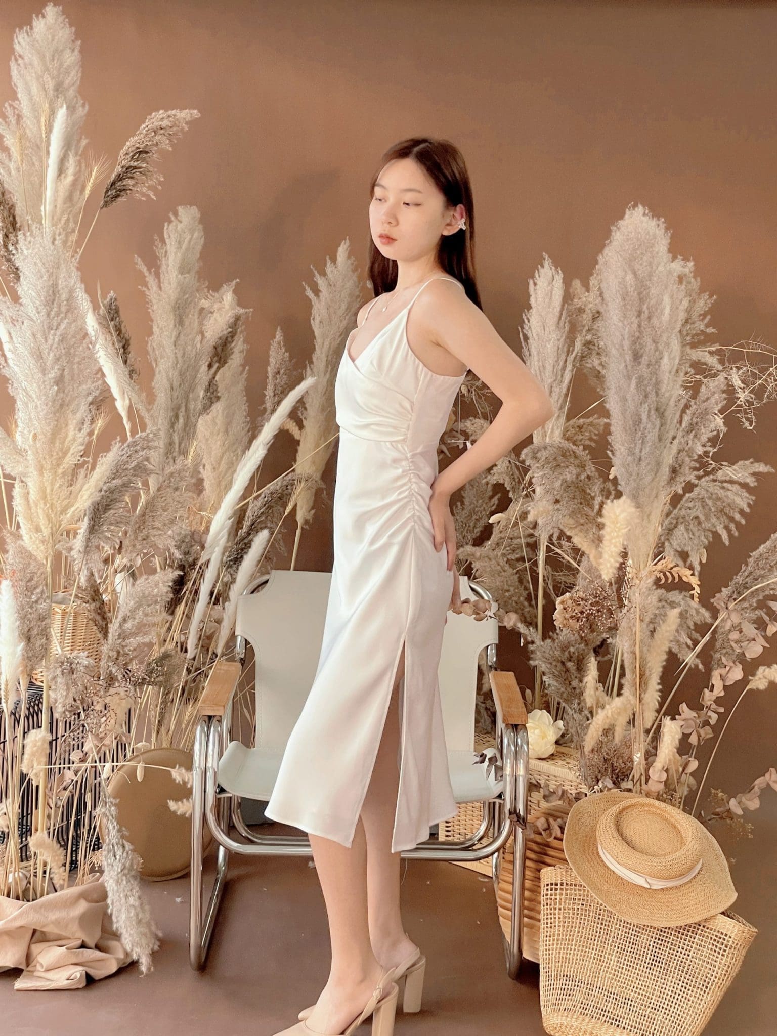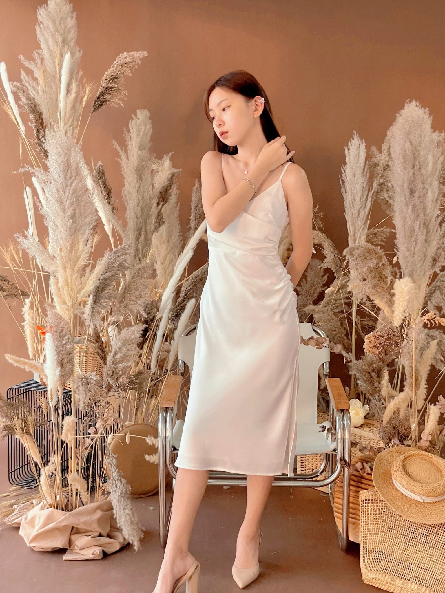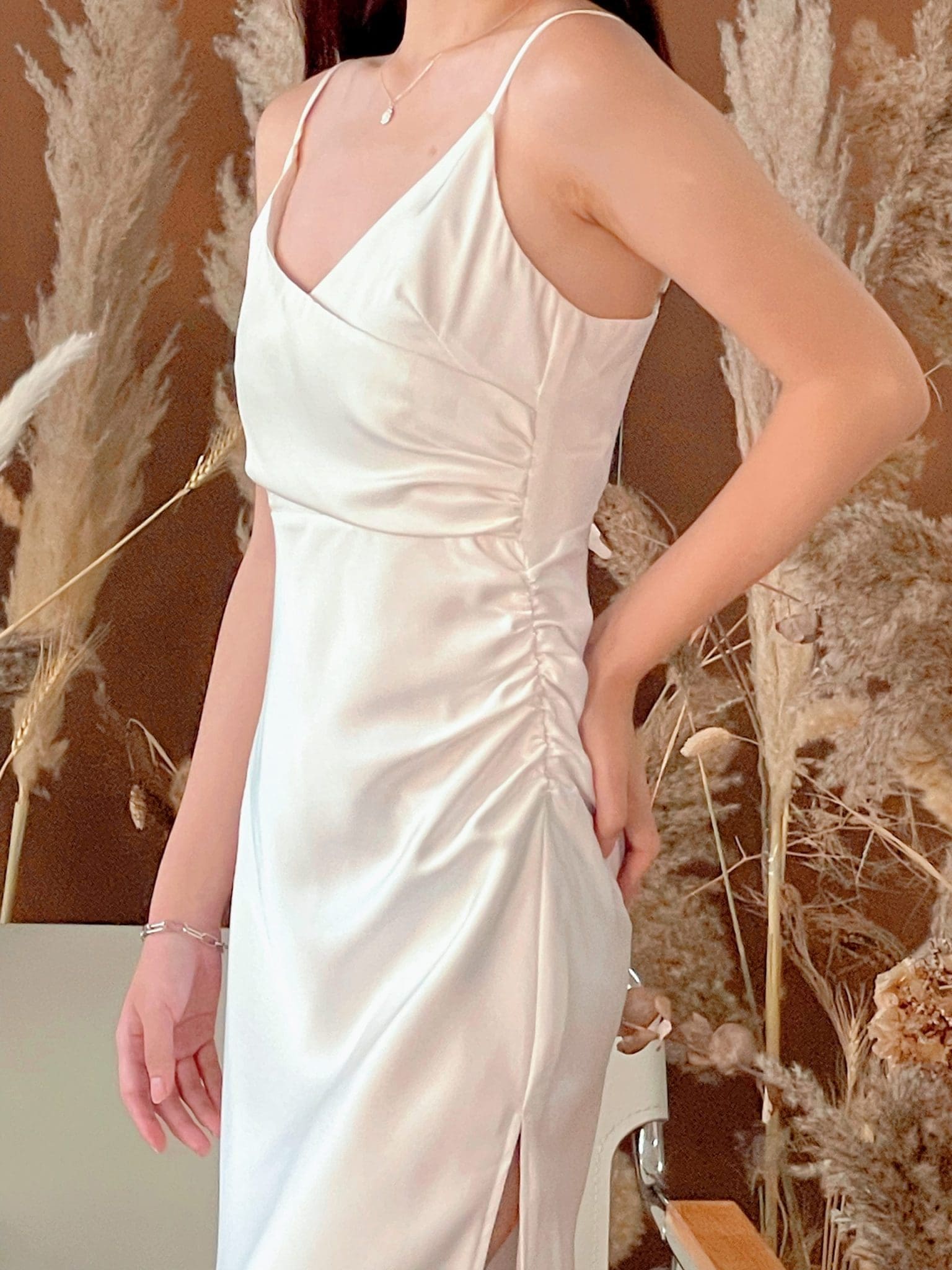 Made of poly-satin , Non-stretchable, Adjustable straps, Straight cut dress, Front side slit, Side zipper, Breathable lining.