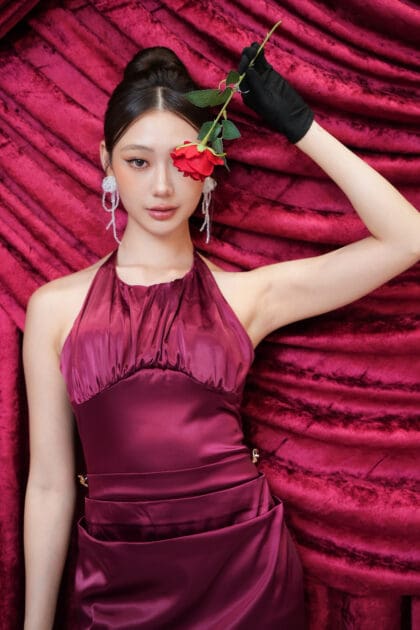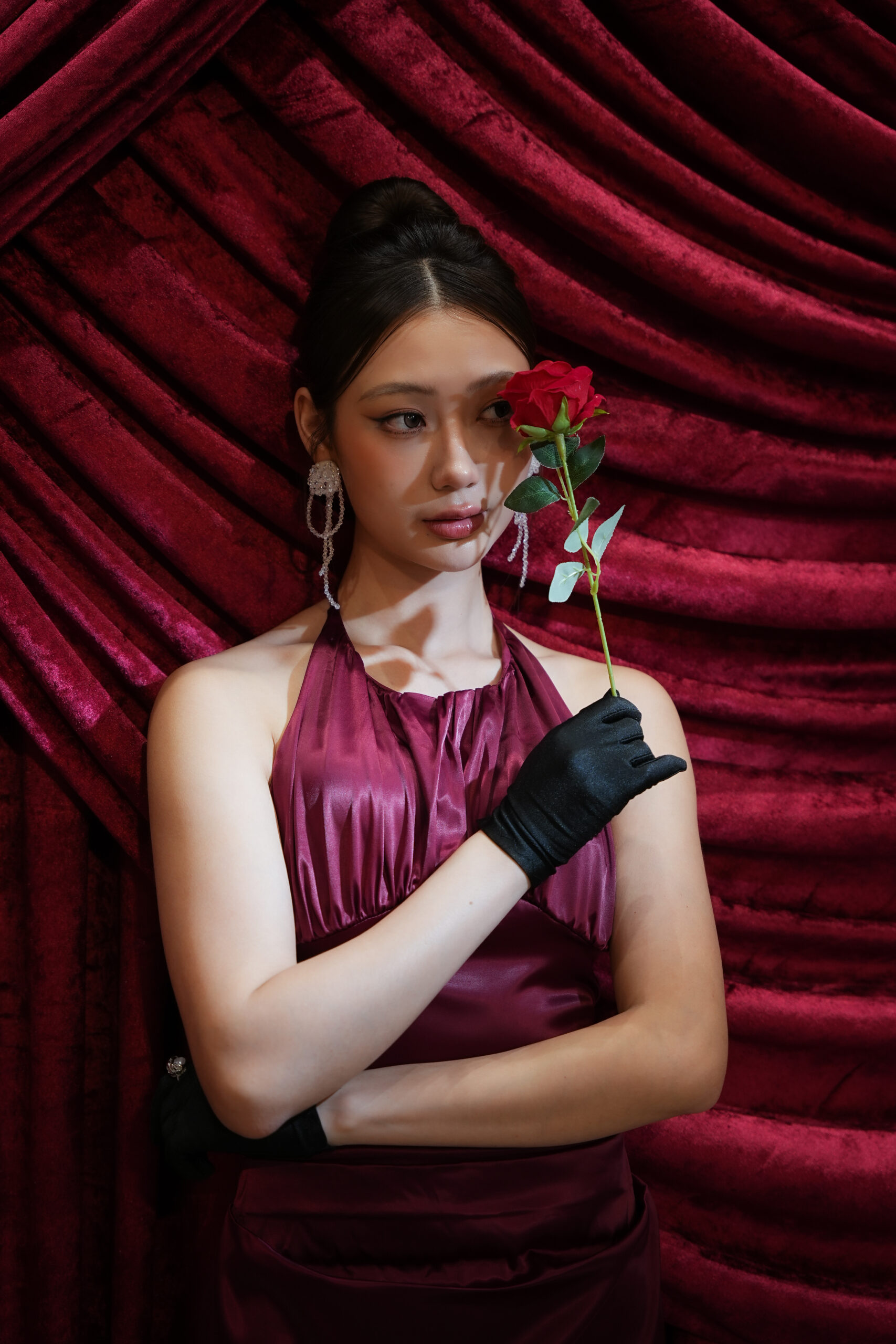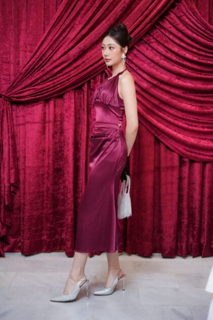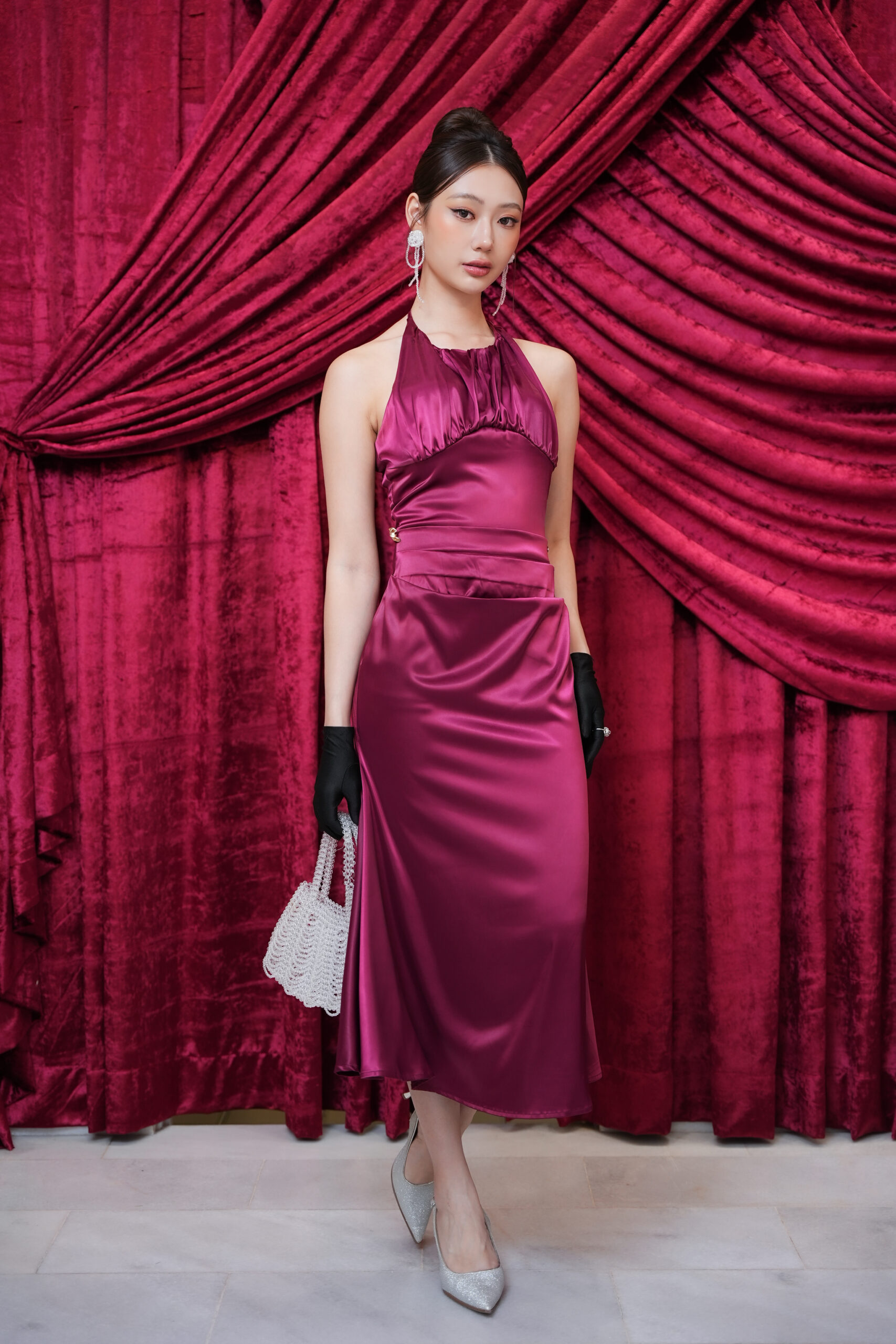 Made of Satin fabric, halter-style design with subtle gathered detailing along the neckline and bust area, bust padding provided, featuring gold embellishment at both side waist, zipper at back.