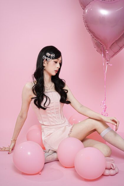 Made of Satin fabric, featuring corset with fishbone design at front, decorative lace trim along neckline, adjustable shoulder strap and bust padding provided