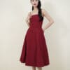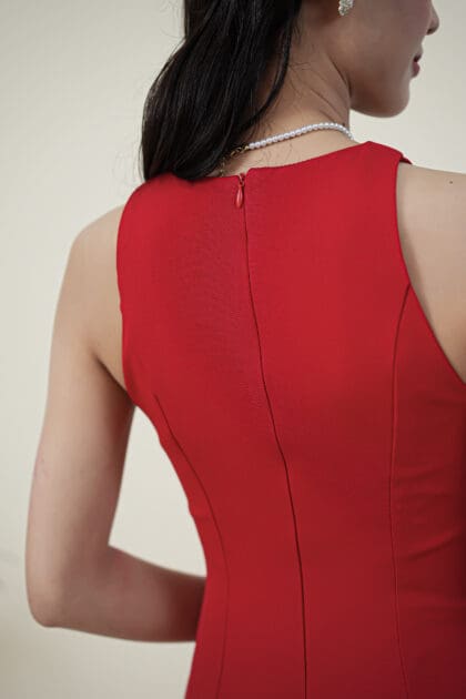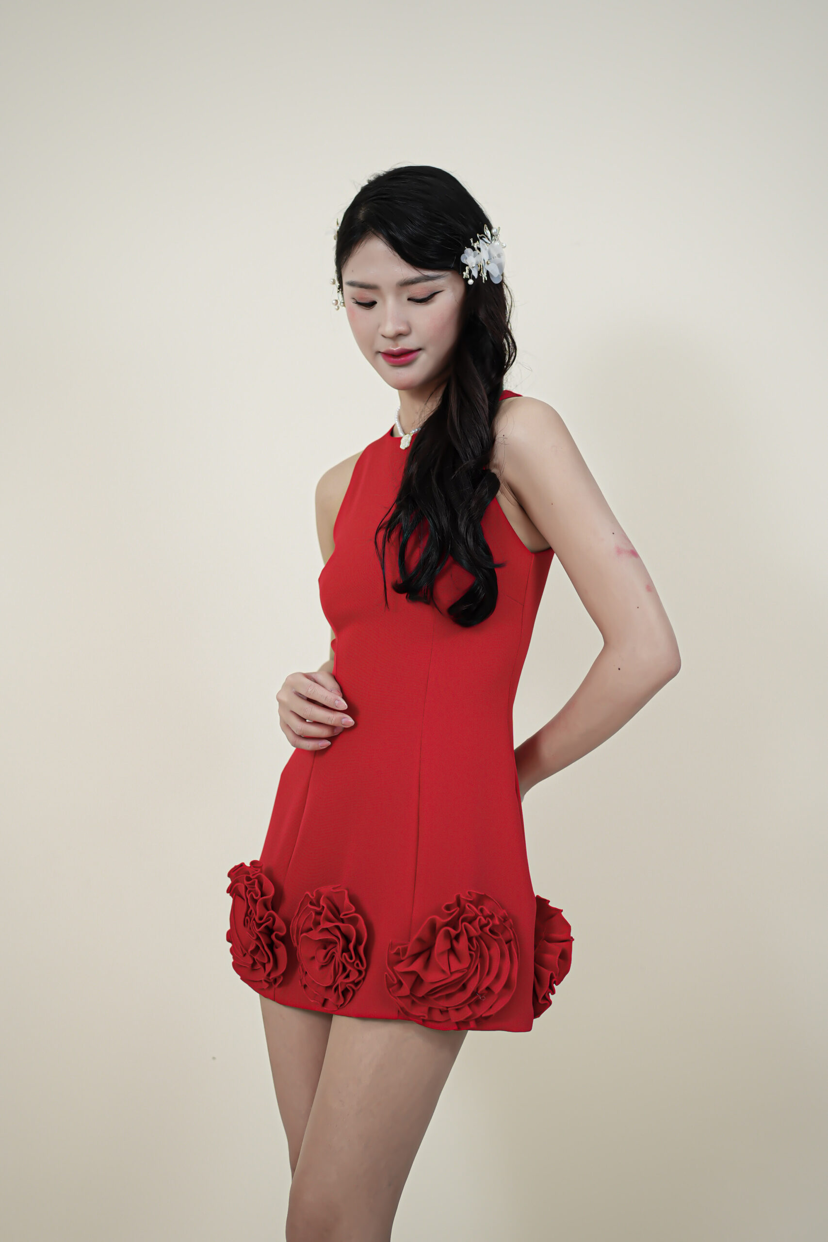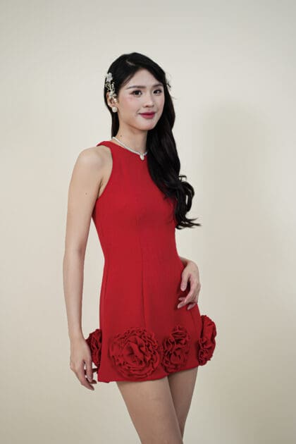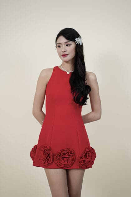 Made of cotton fabric, decorative flower patch located at bottom hem, invisible zipper at center back