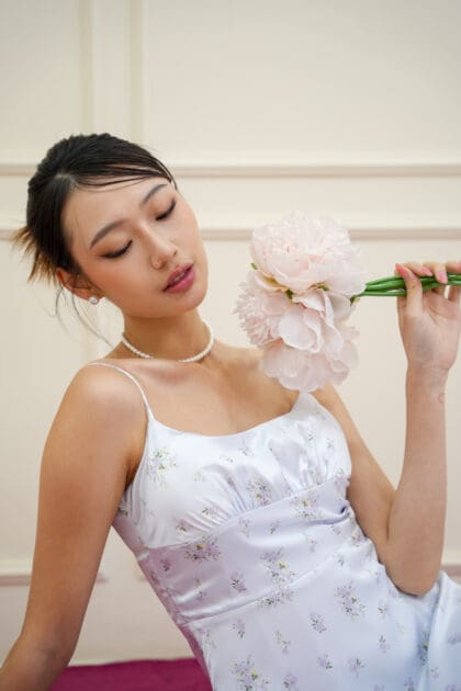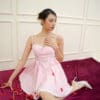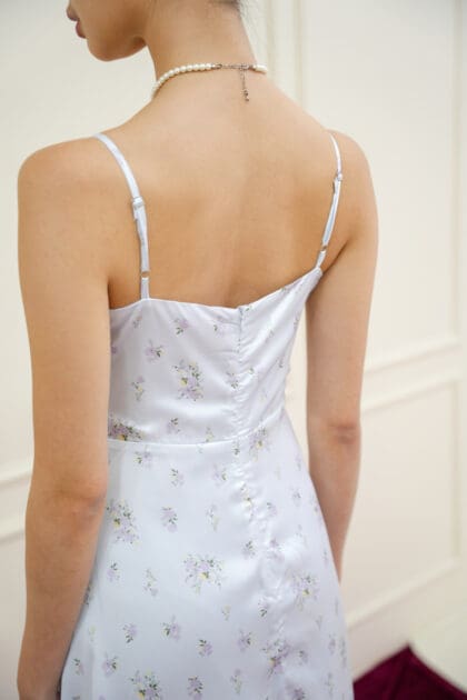 Made of satin, Invisible zipper at the back, Padded, Adjustable strap, Panel with gathers design at front bust area, Gather flare design at bottom of dress, Lining inside