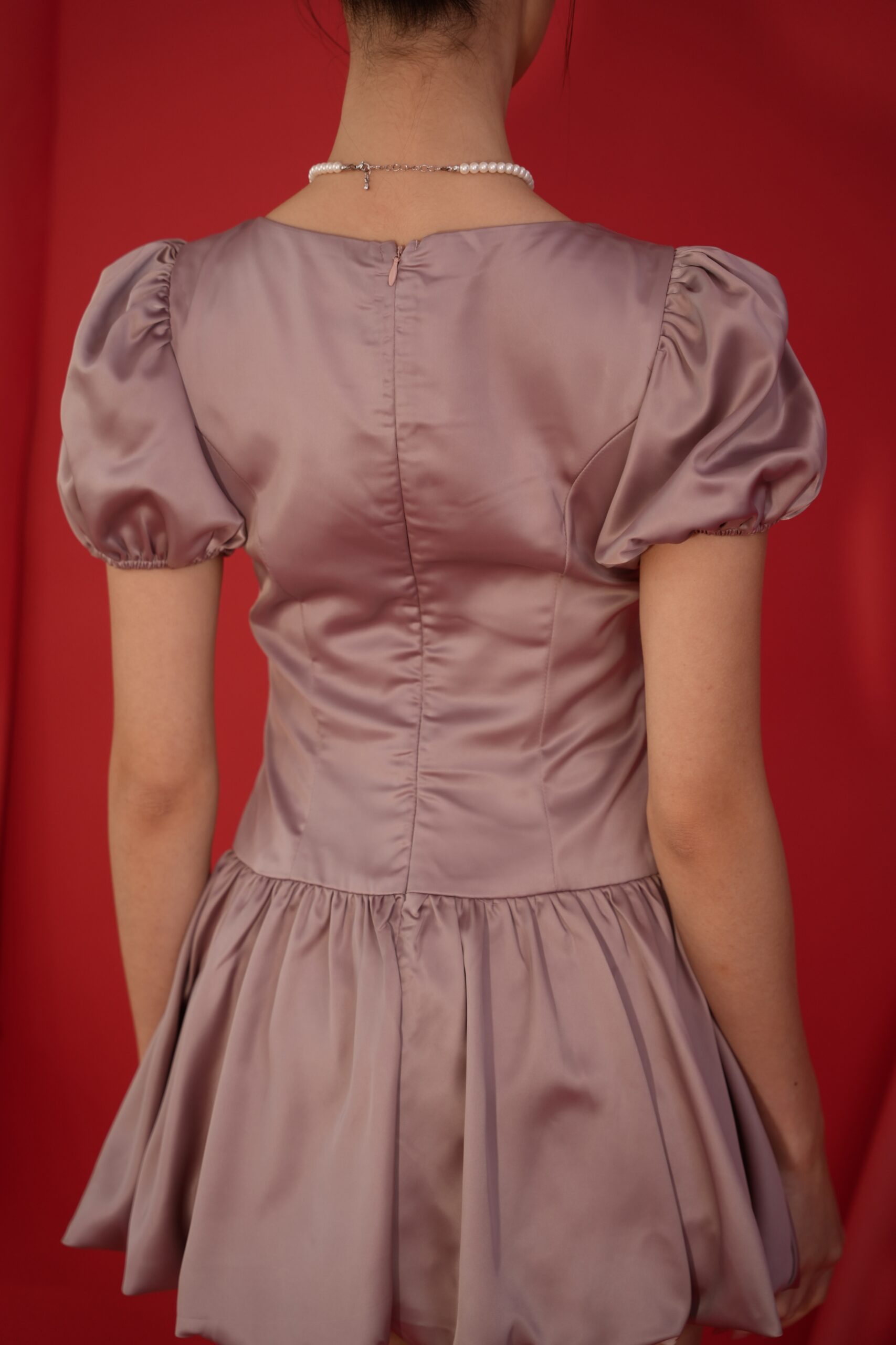 Made of satin, Invisible zip at the back, Padded, R8 logo embroidery design at front side, Puff sleeve design, Bubble design at bottom of dress, Lining inside