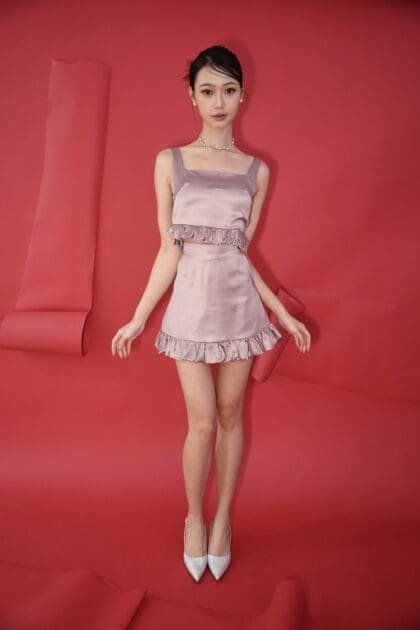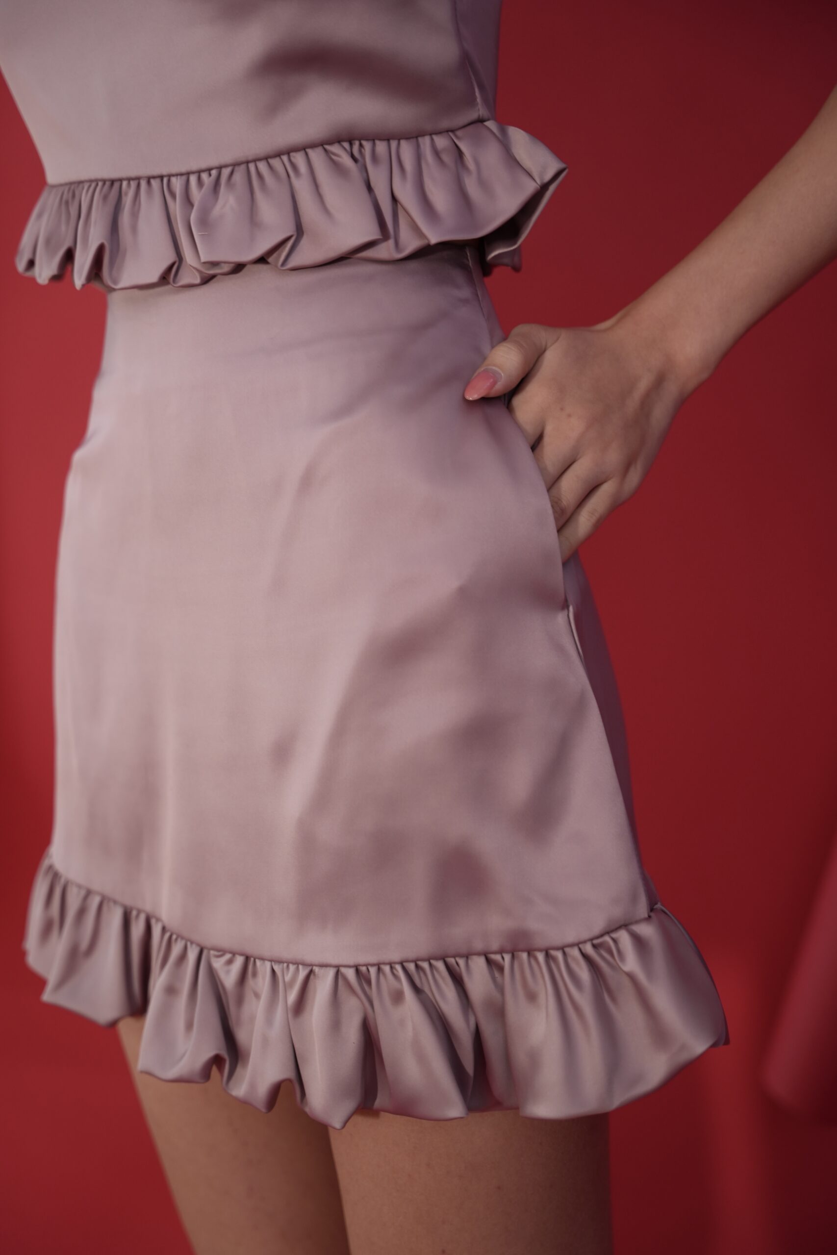 Made of satin, Invisible zipper at the back, Bubble design at bottom hem, Side pocket at each side, Short lining