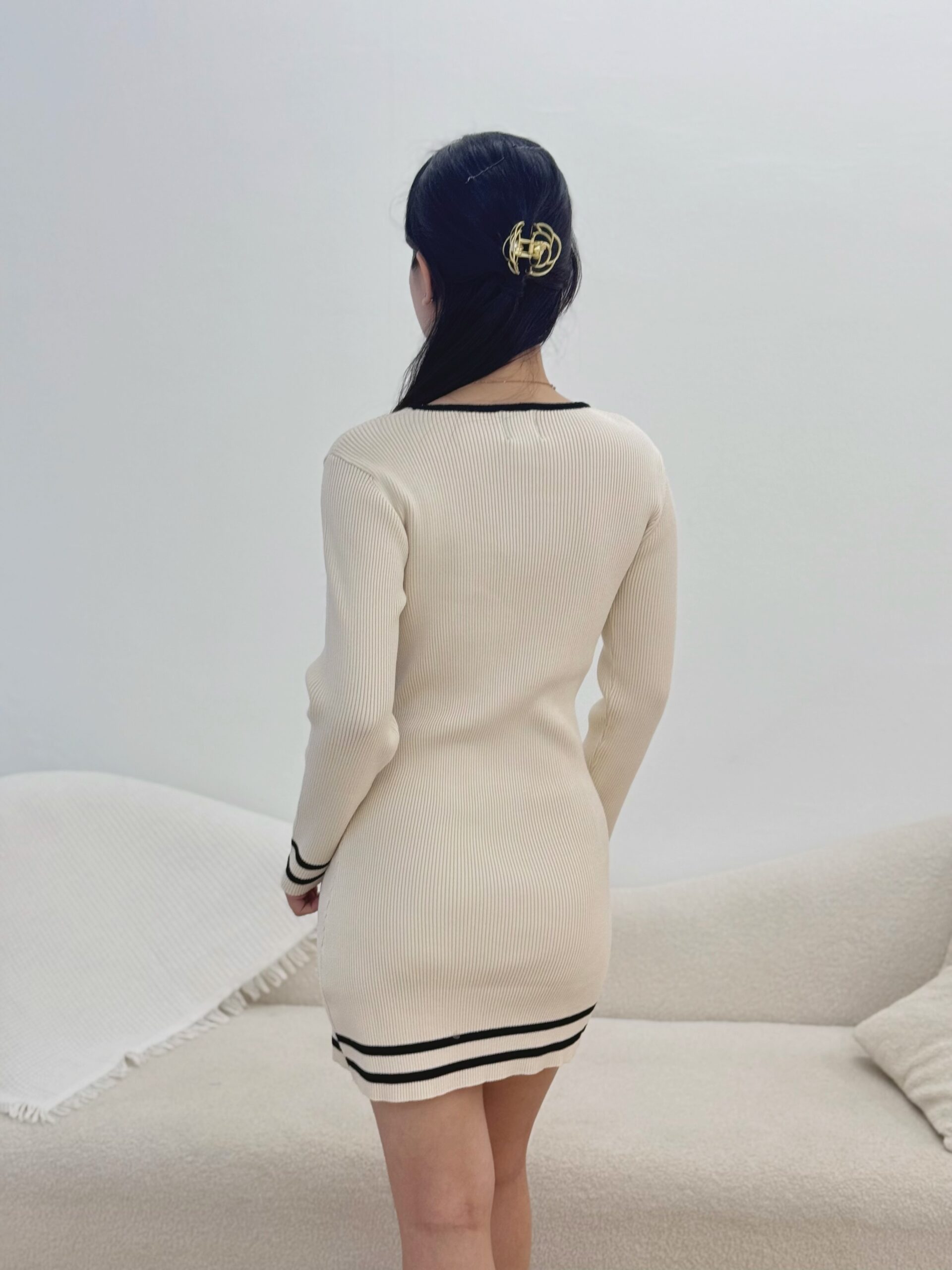 Made of knitted fabric, Stretchable, Border line design at cuff, neckline, bottom of dress area, Label logo patched