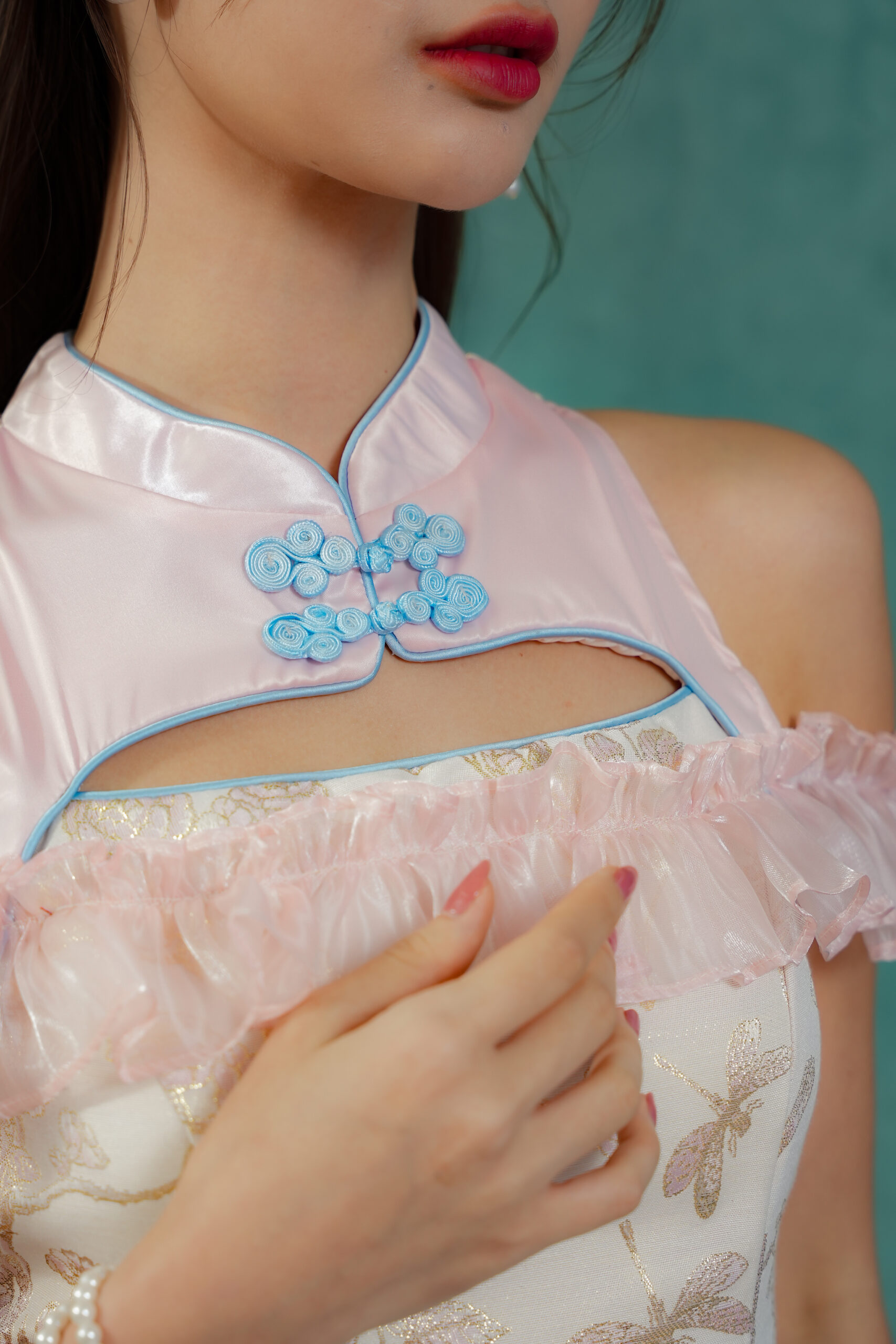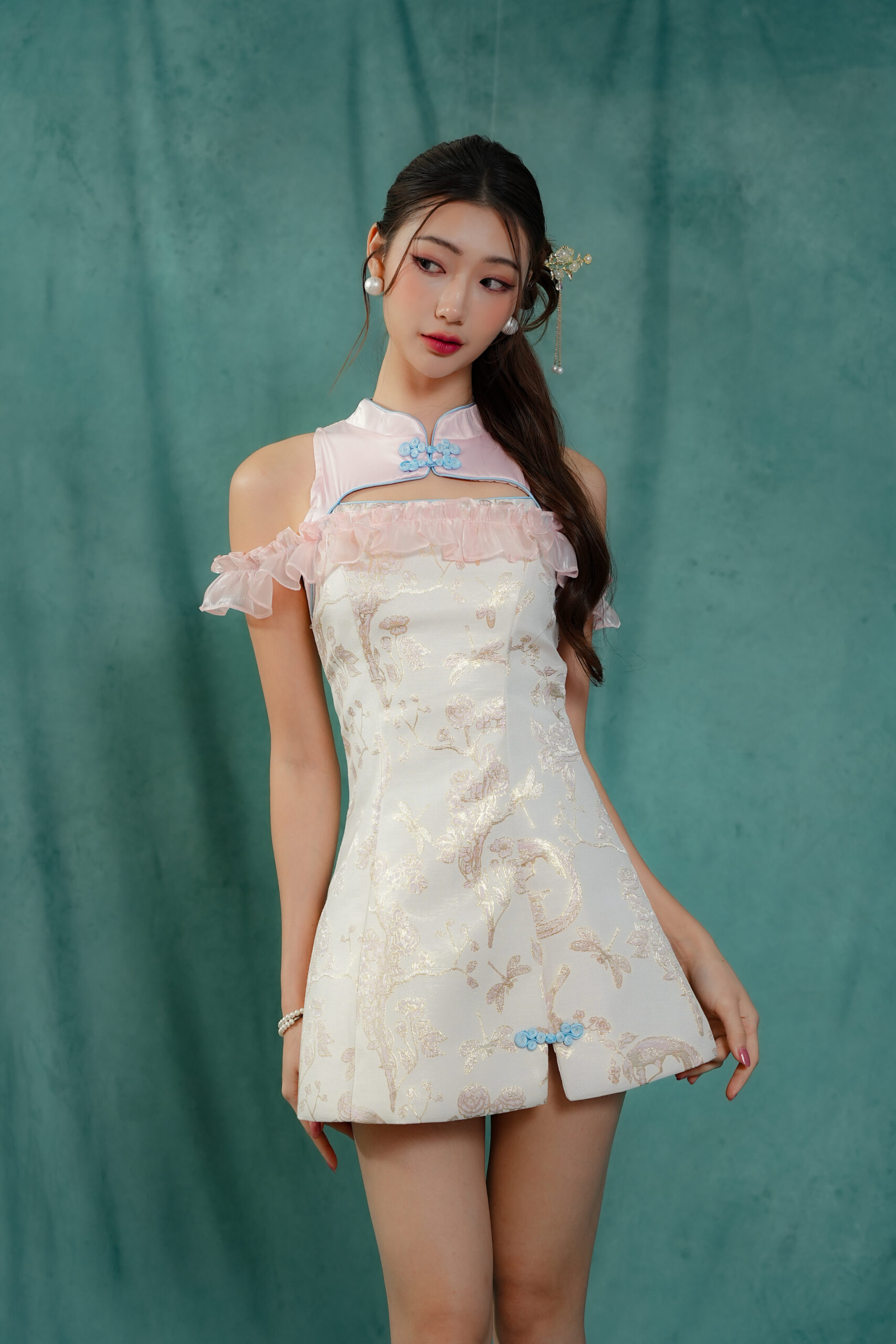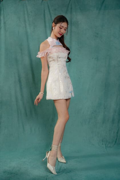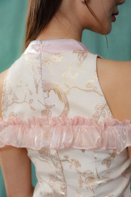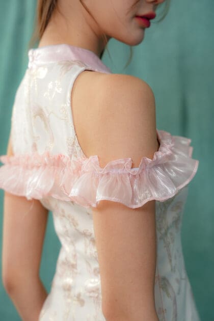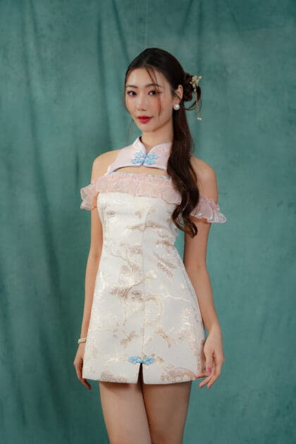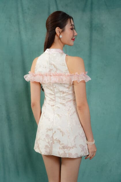 Made of Brocade fabric & organdy fabric (detailing), functional frog button at front, features invisible zipper at back, elastic off-shoulder ruffle sleeve, and front cut-out design , lining inside