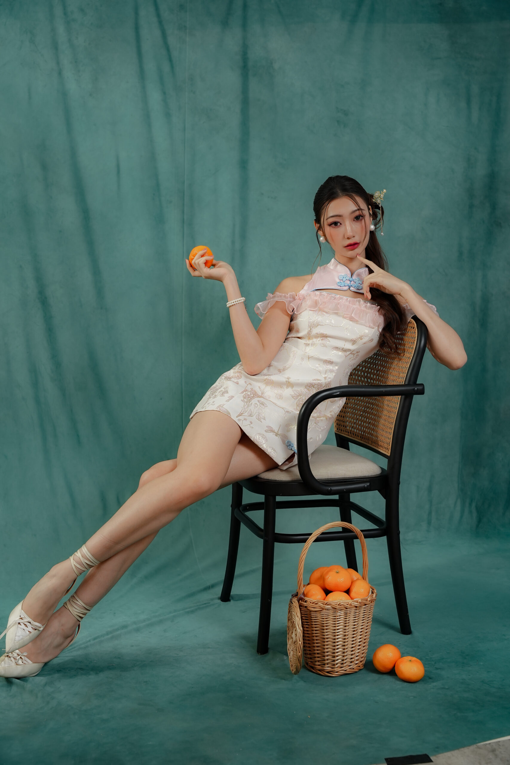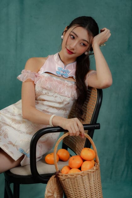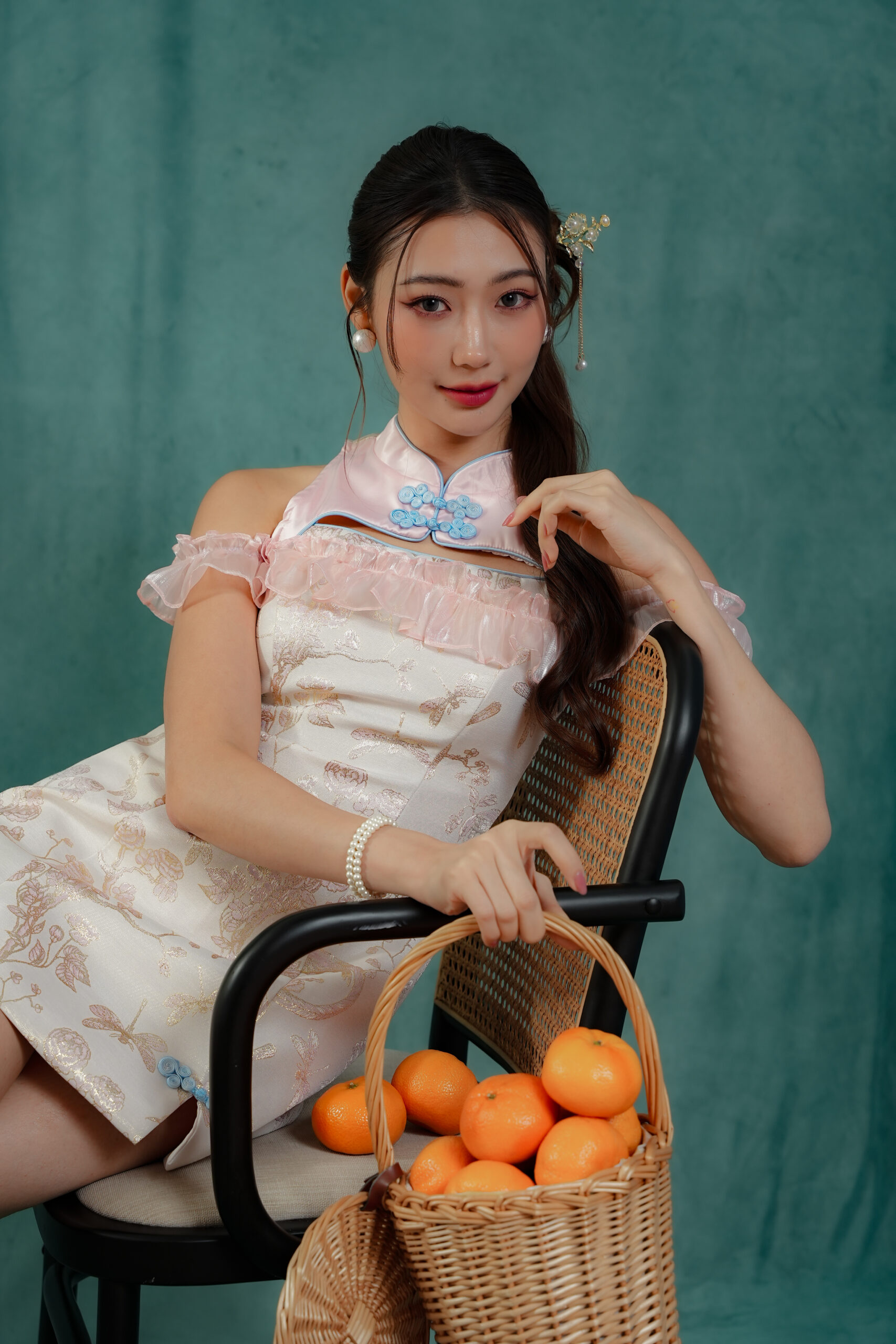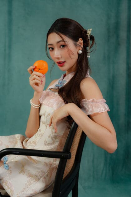 Made of Brocade fabric & organdy fabric (detailing), functional frog button at front, features invisible zipper at back, elastic off-shoulder ruffle sleeve, and front cut-out design , lining inside