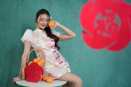 Made of Brocade and Satin Fabric, featuring chinese collar, puff sleeve design, inner lining provided, invisible zipper at back, decorative frog button at front