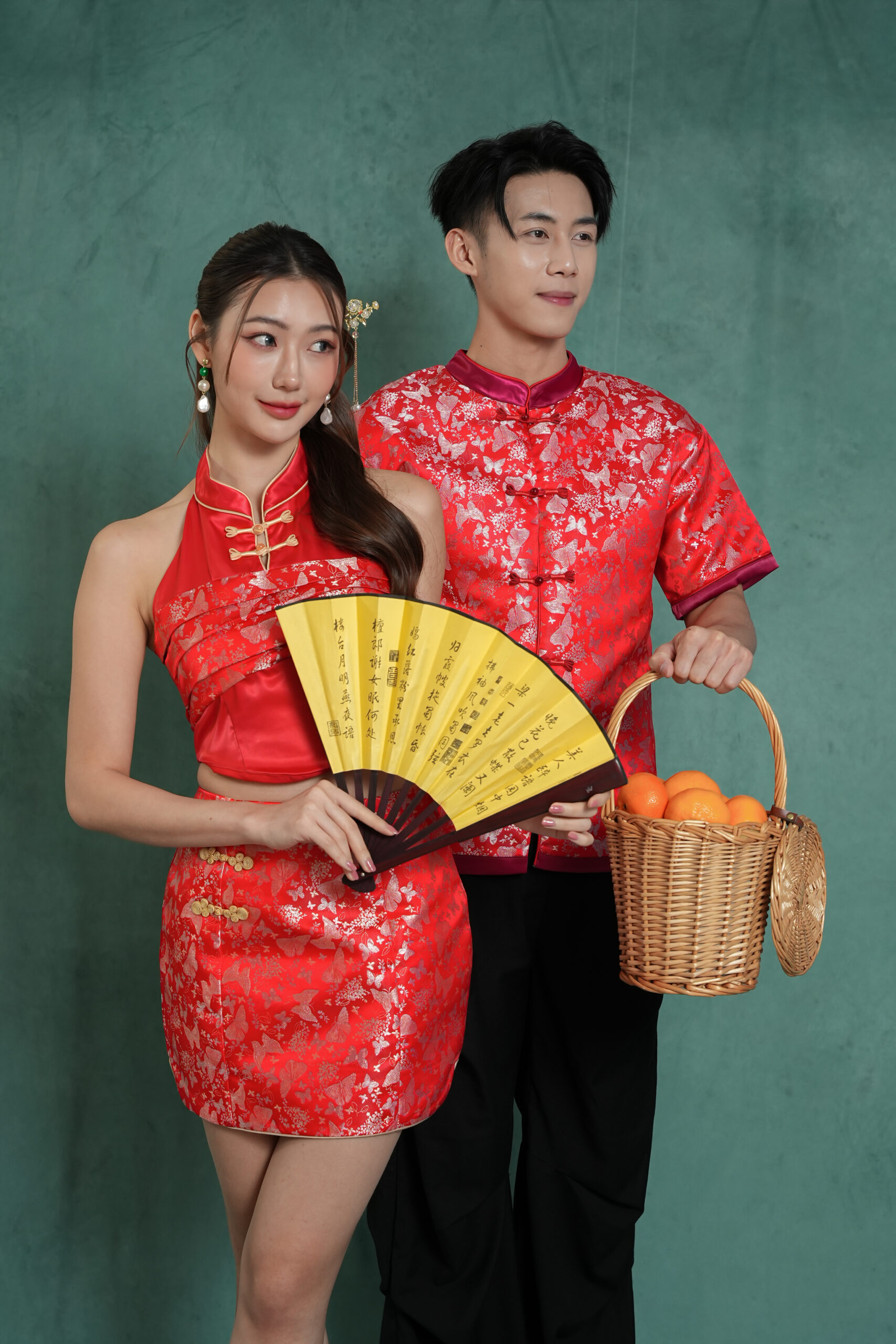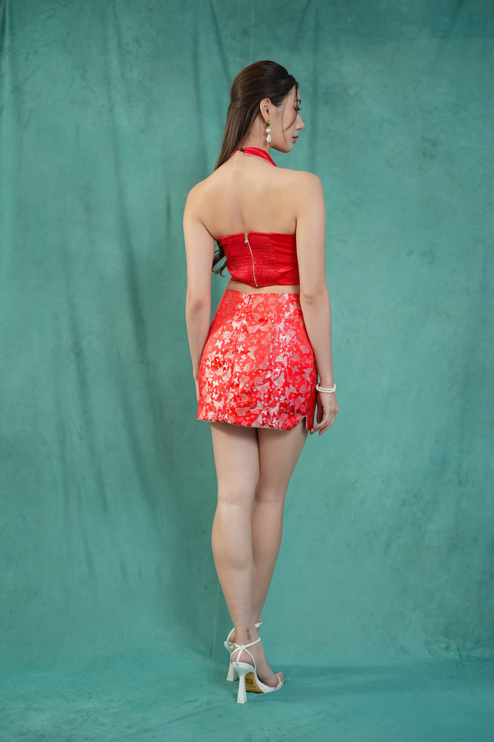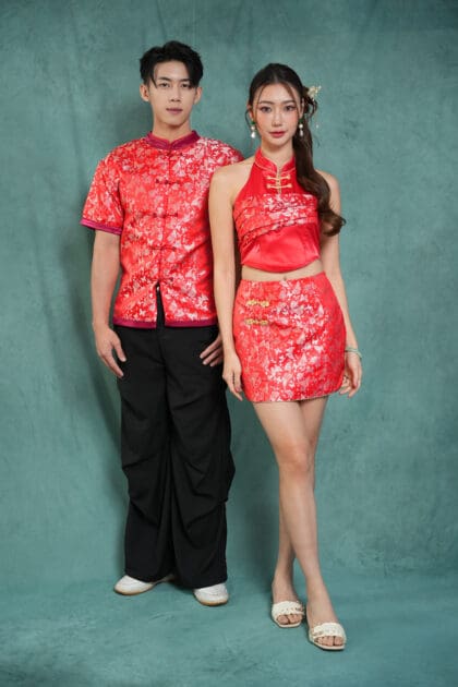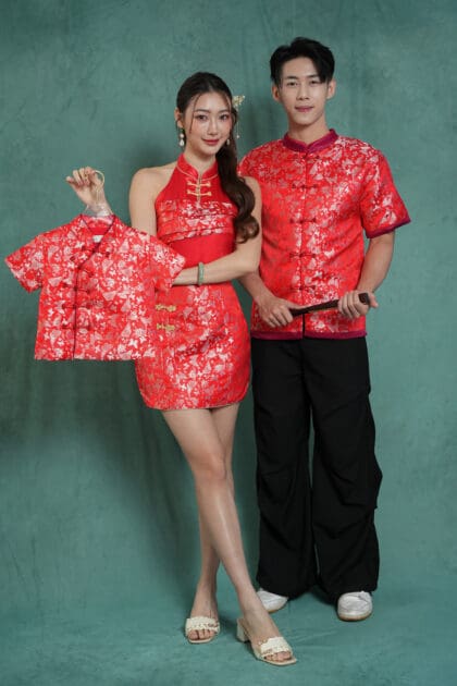 Made of Brocade and Satin fabric, featuring two decoration frog button at front, invisible zipper at back, safety pants and inner lining provided