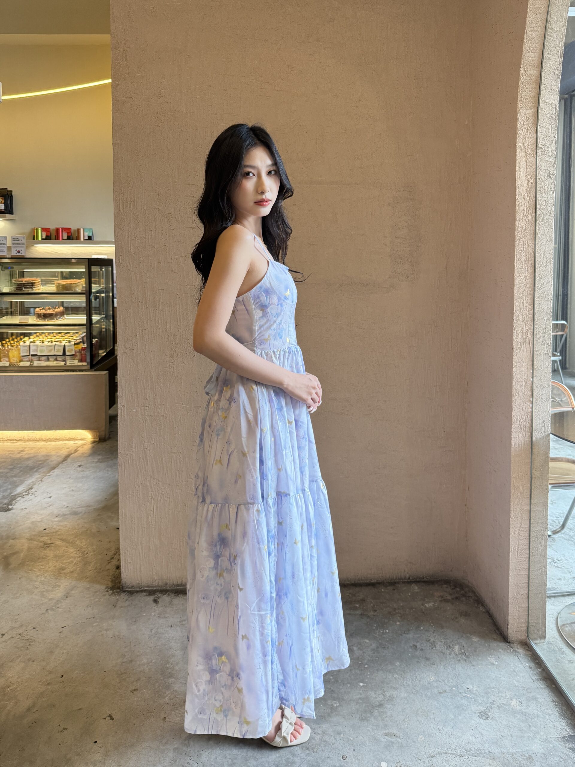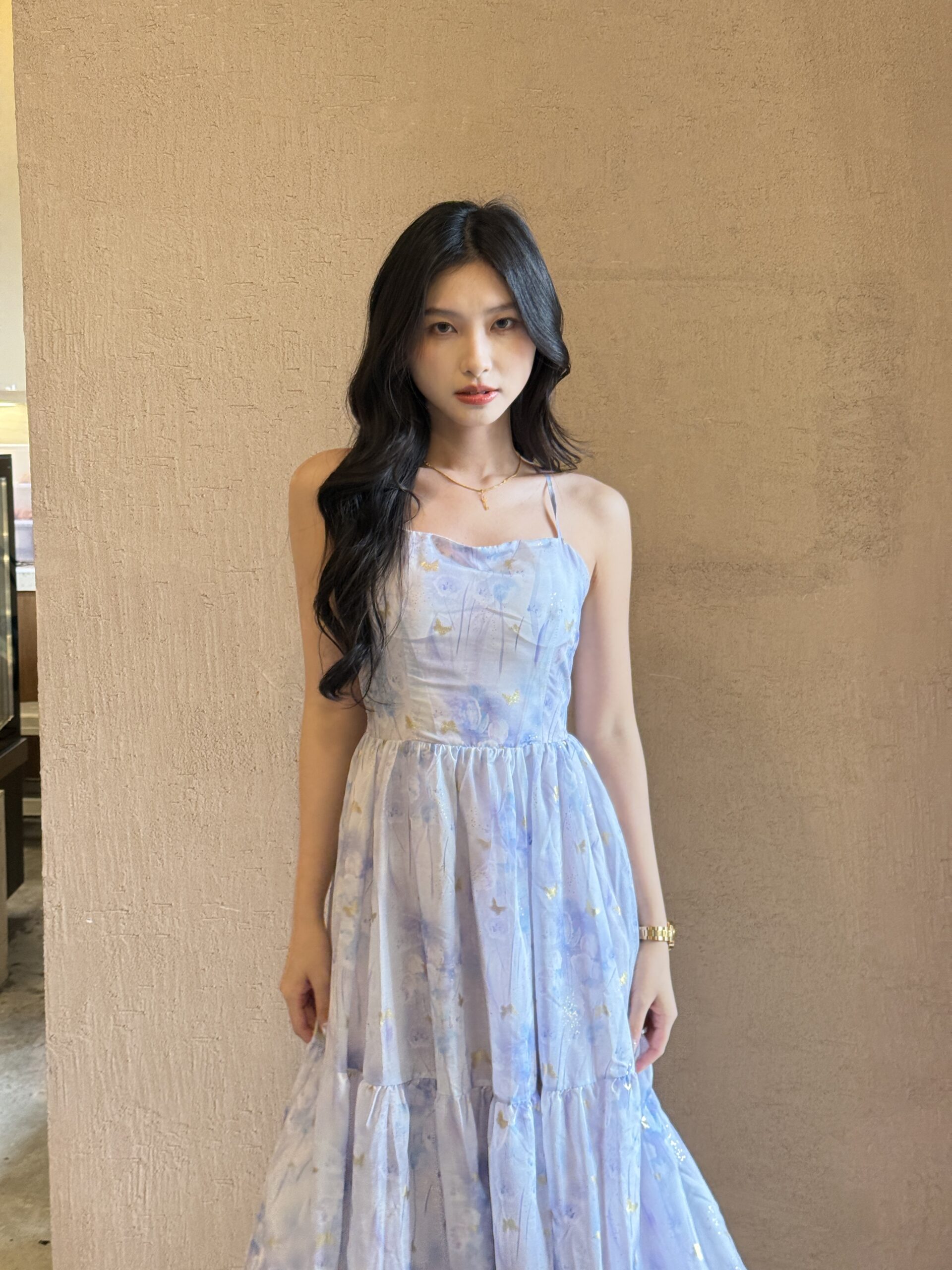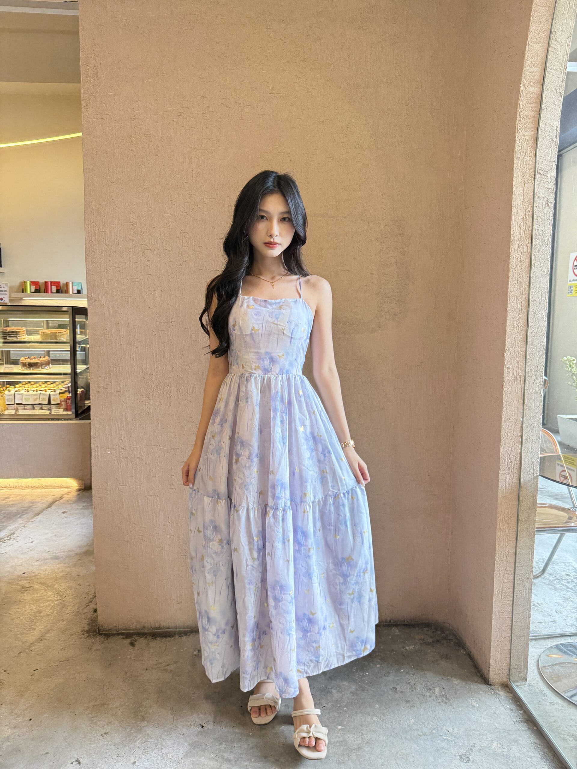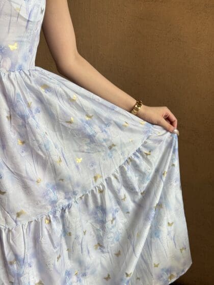 Made of chiffon print fabric, featuring cross-step back design, invisible zipper and back, lining inside