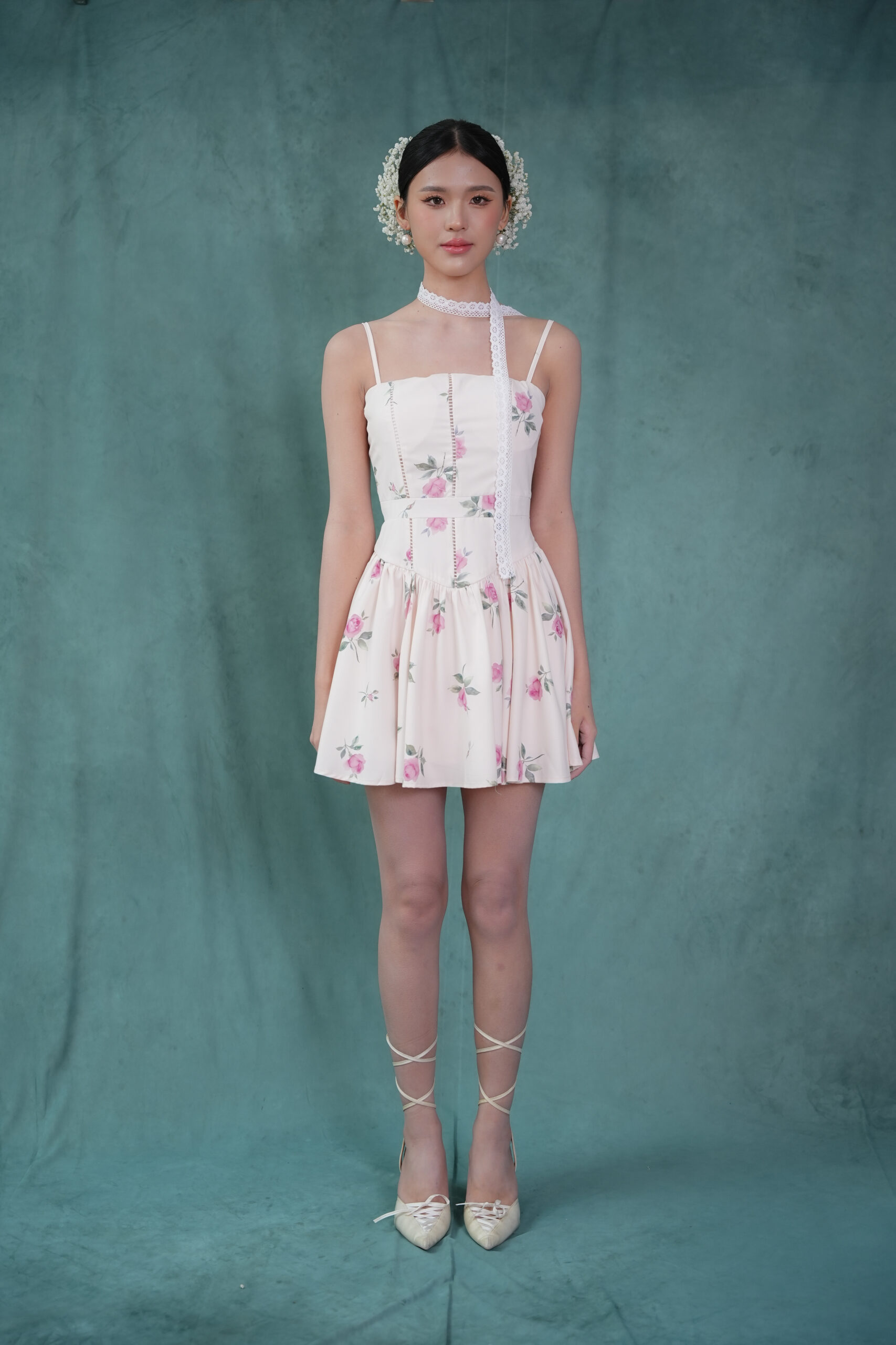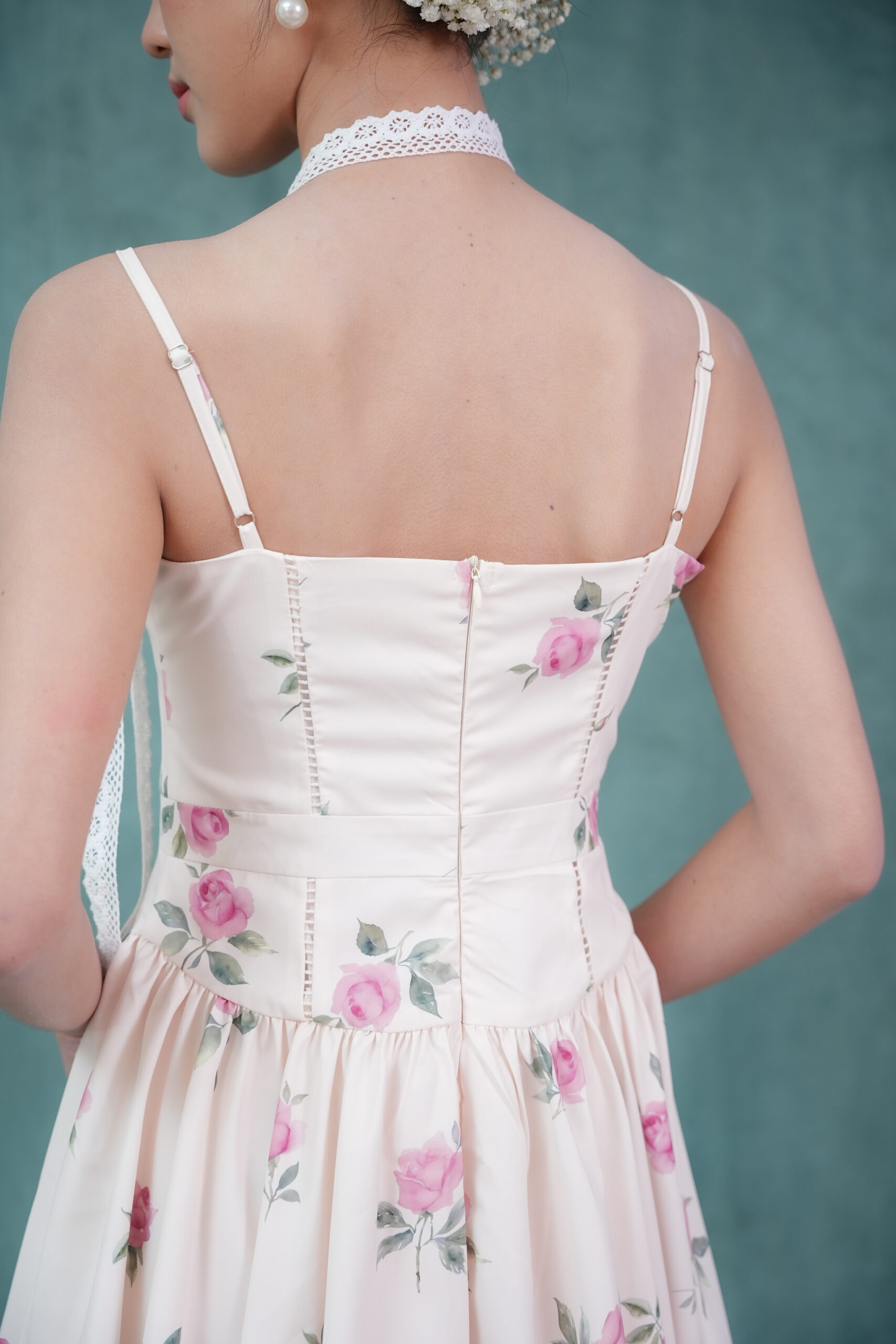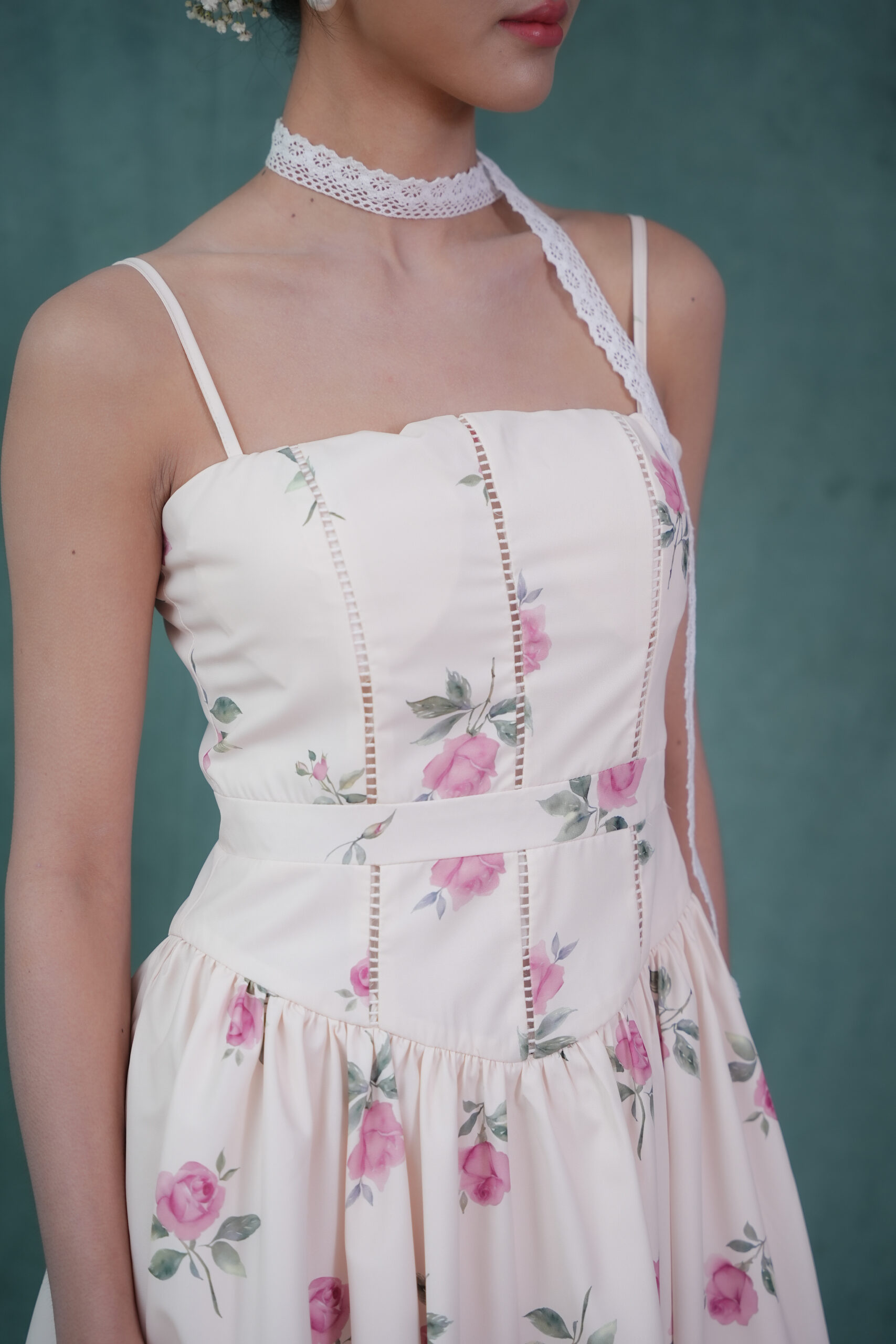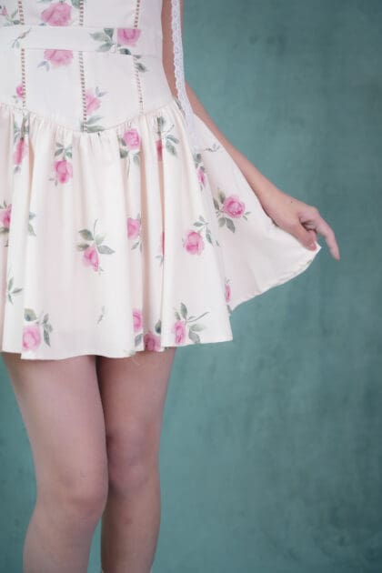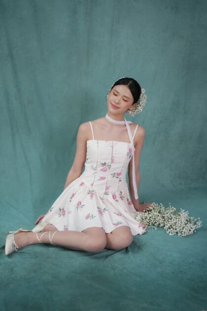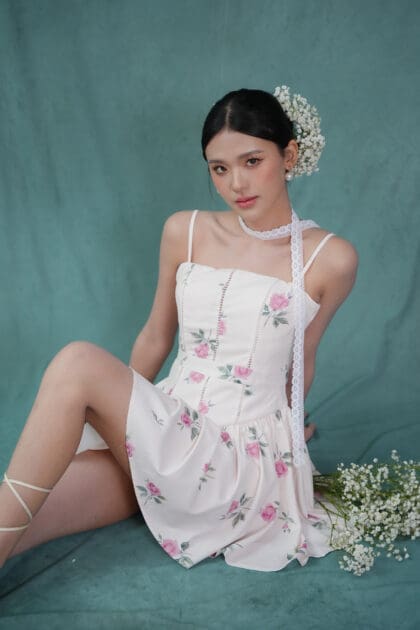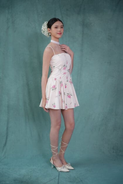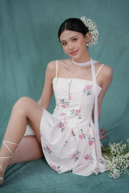 Made of printed woven fabric with rose print design, adjustable shoulder strap, inner lining provided, features bust padding, gathers design at waistline
