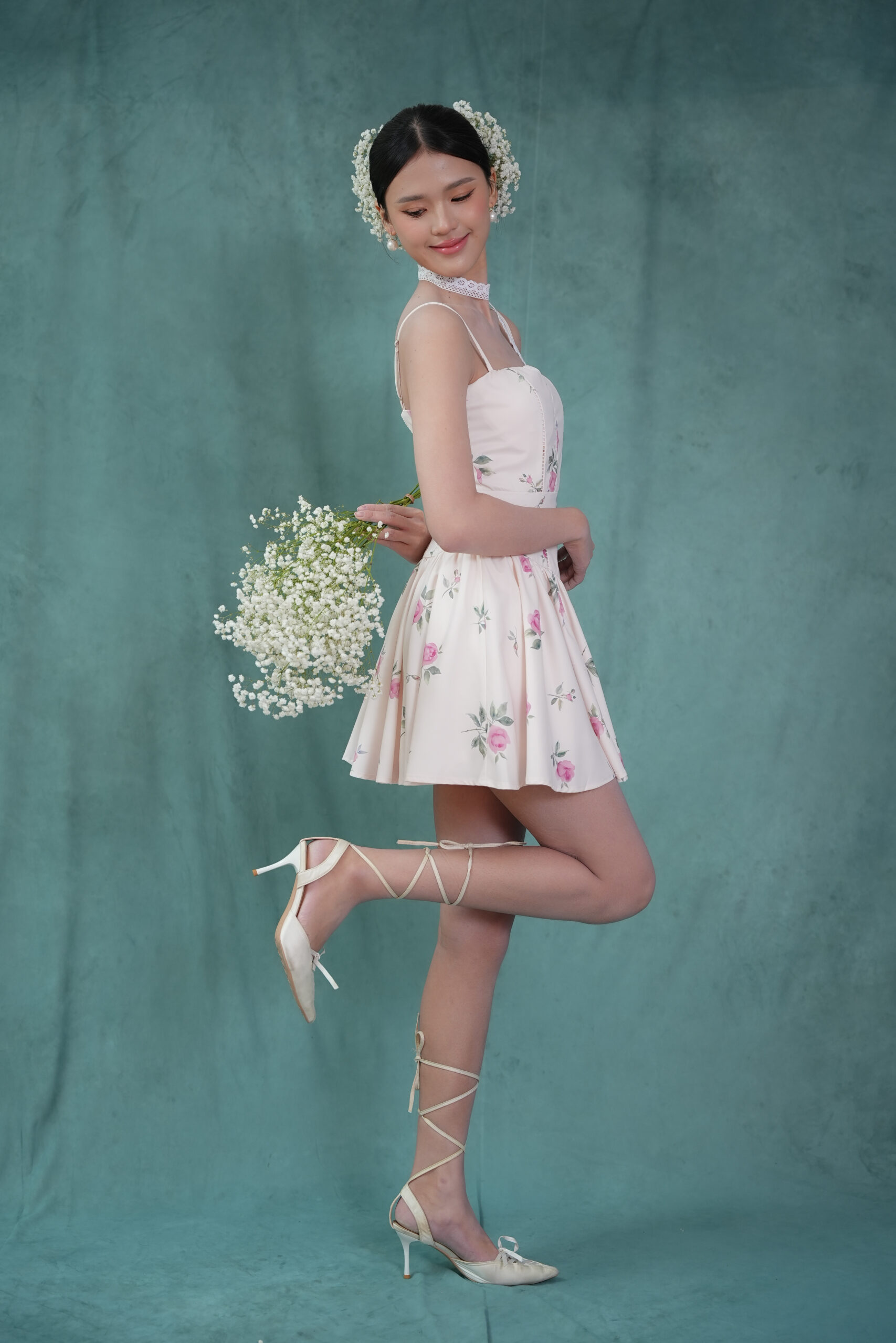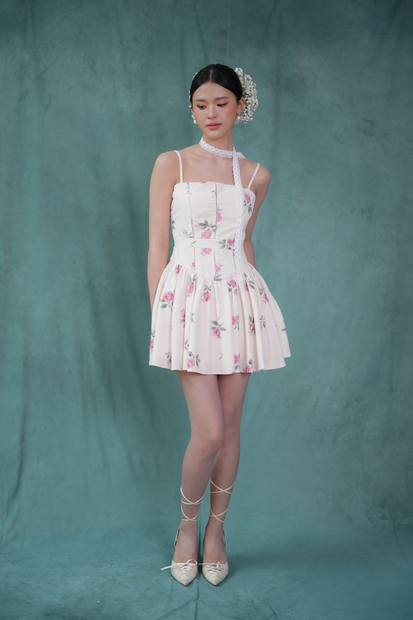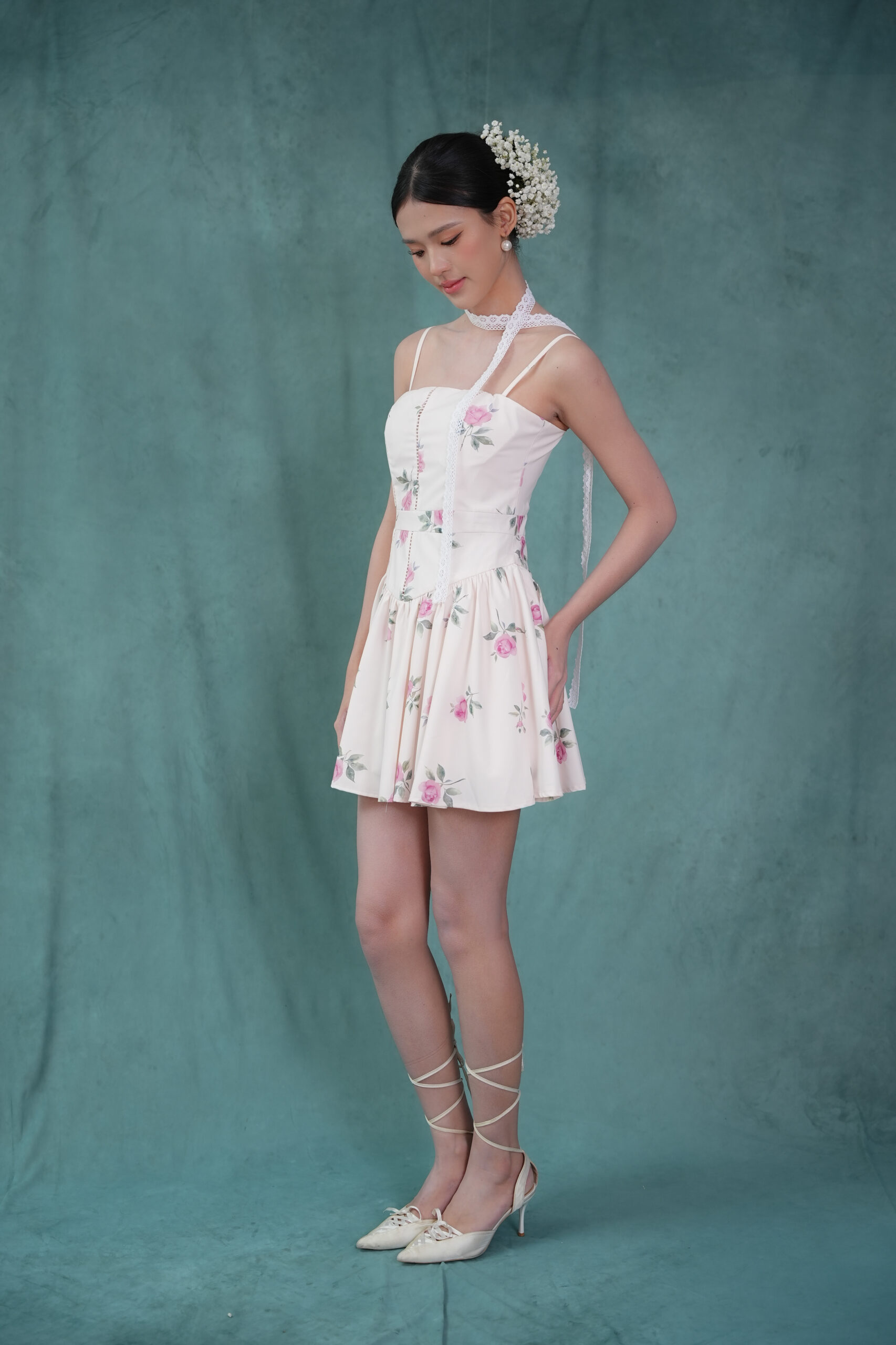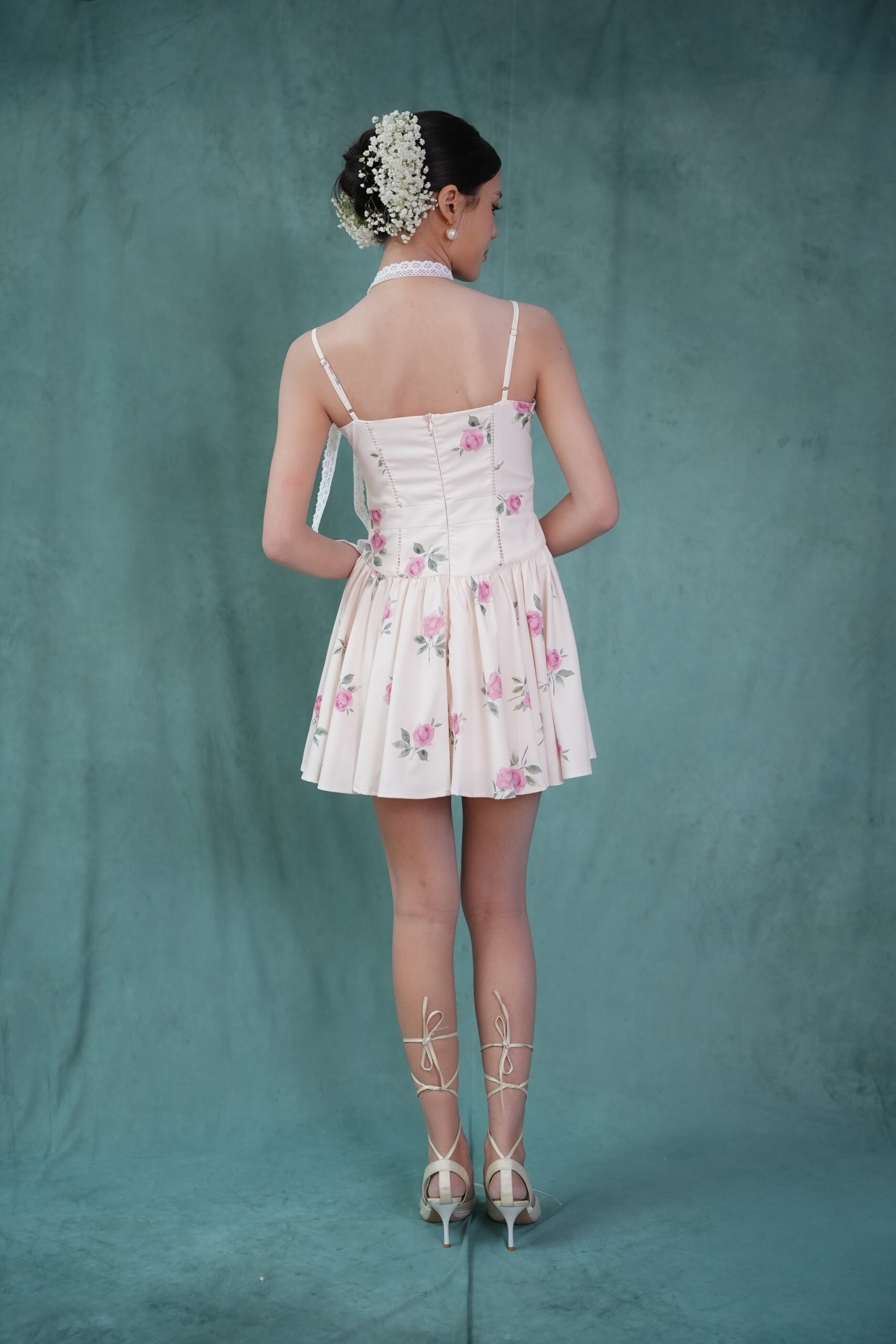Made of printed woven fabric with rose print design, adjustable shoulder strap, inner lining provided, features bust padding, gathers design at waistline