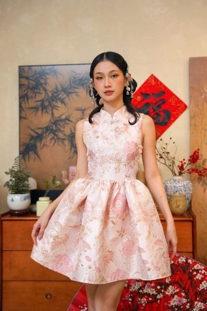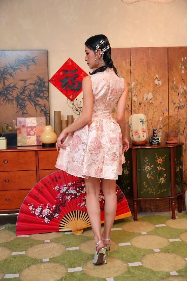 Made of brocade, Invisible zipper at the back, No padding, Gathered dress, Chinese collar design, Fake frog fastening