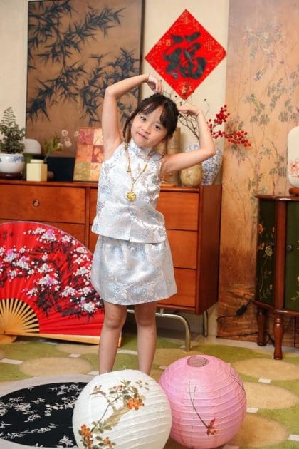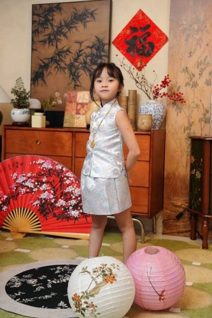 Top – Made of satin and brocade, Frog fastening at front, Chinese collar design, Lining inside