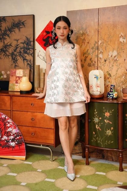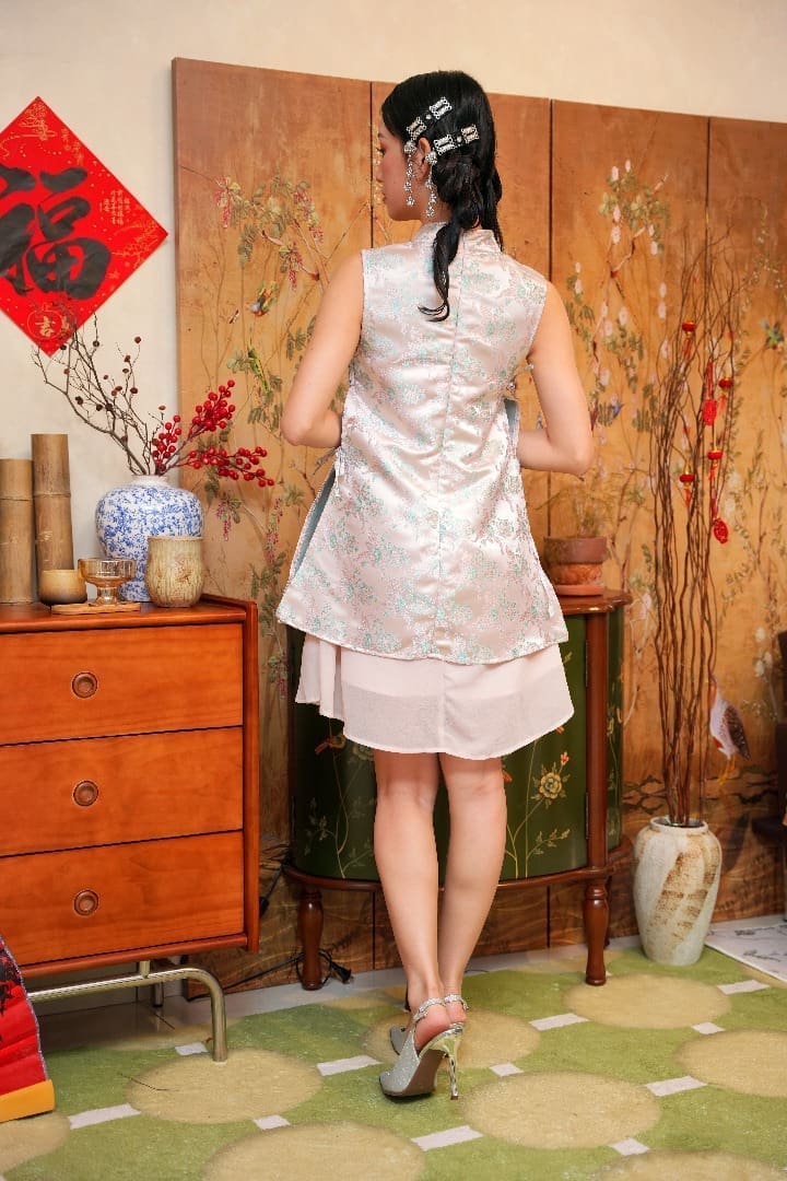 Made of brocade, Chiffon base dress inside, Invisible zip at back, No padding, Fake Loop and button opening at front, Tied ribbon opening at side, Chinese collar design, Lining inside