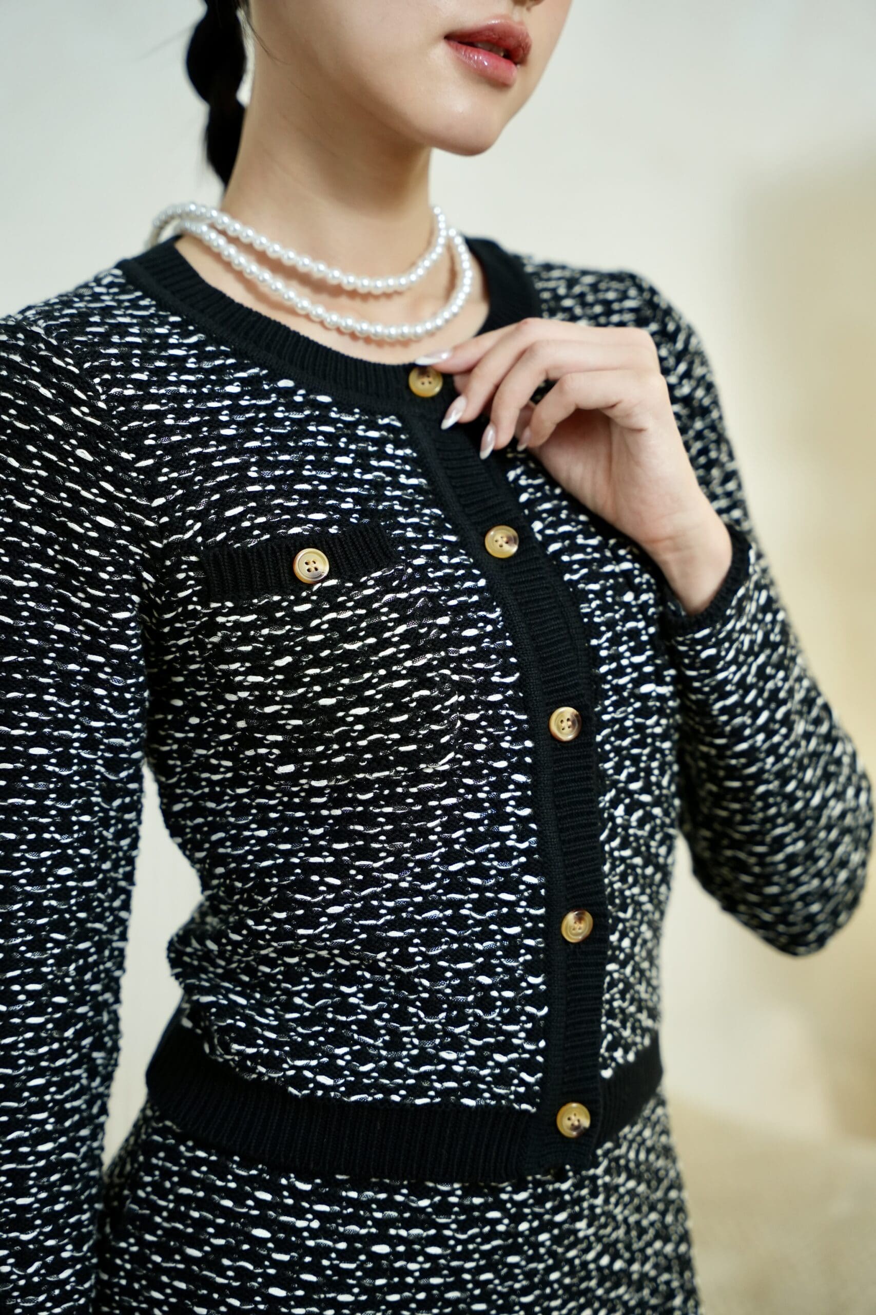 Made of knit fabric, opening buttons at centre front, two patch pockets located at front left and right, round neck design