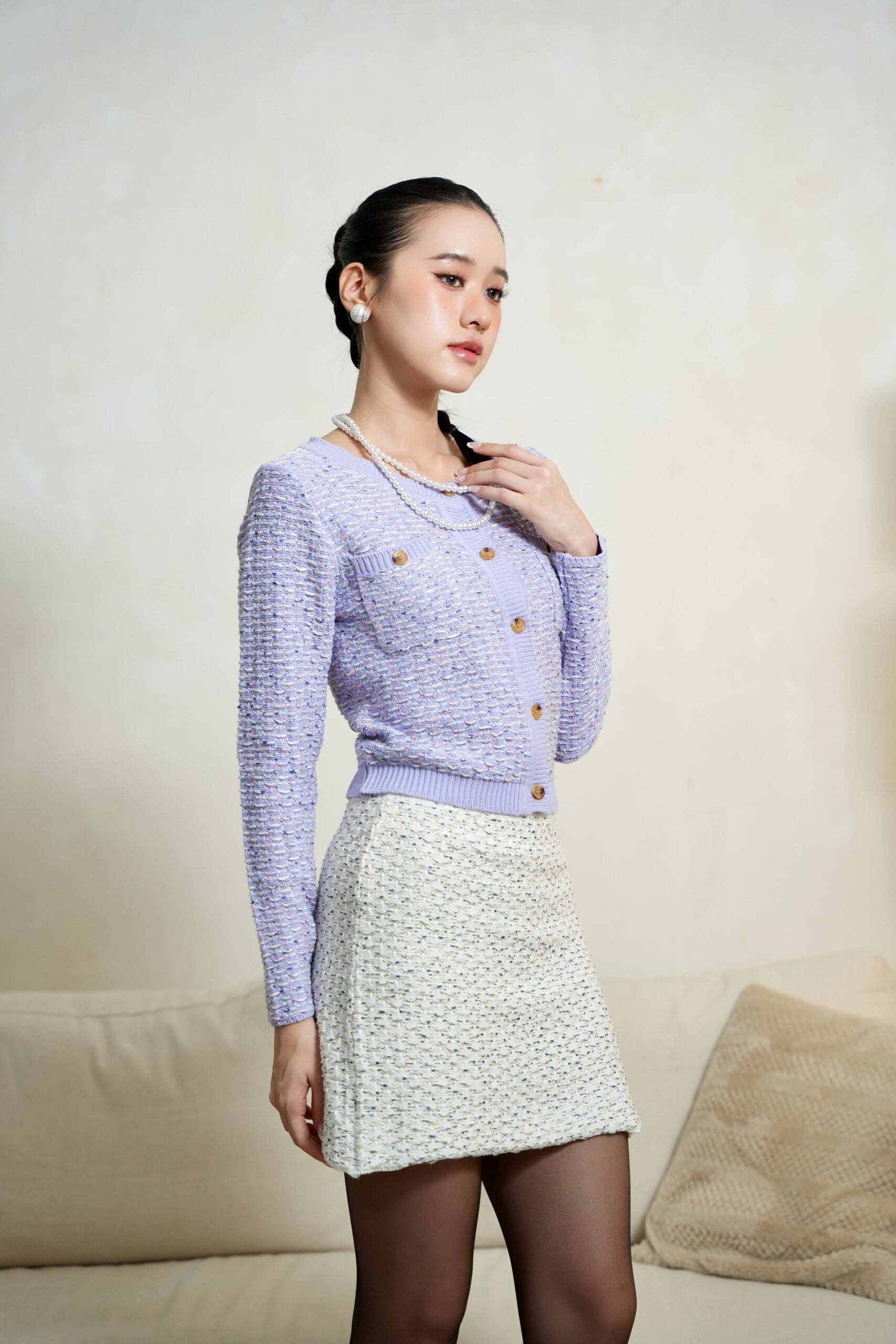 Made of knit fabric, opening buttons at centre front, two patch pockets located at front left and right, round neck design