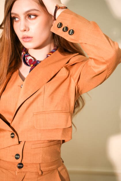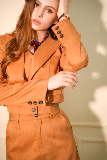 Made of Linea fabric, shoulder pads , two decorative flap pockets located at waist area, decorative single welt pocket located at left bust area.