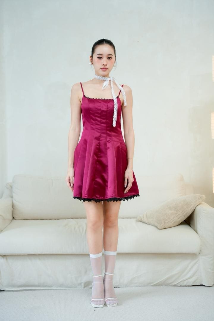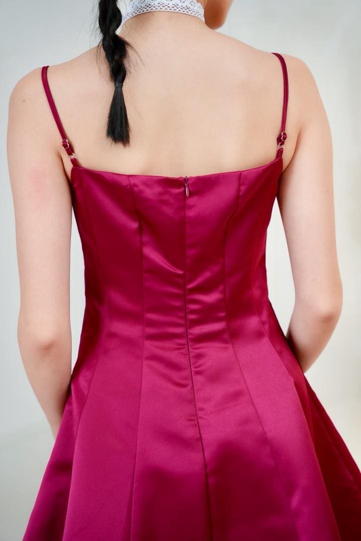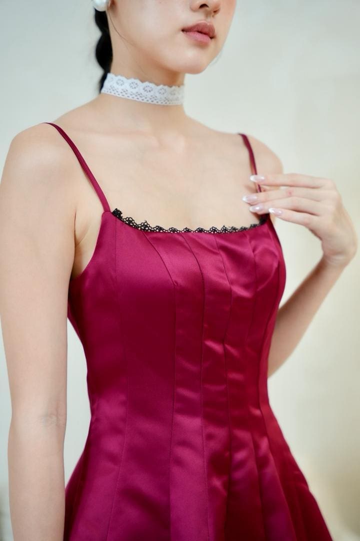Made of Duchess Satin fabric (non stretchy), adjustable shoulder strap, opening zipper at CB, neckline with delicate lace trim detail, lace hemline