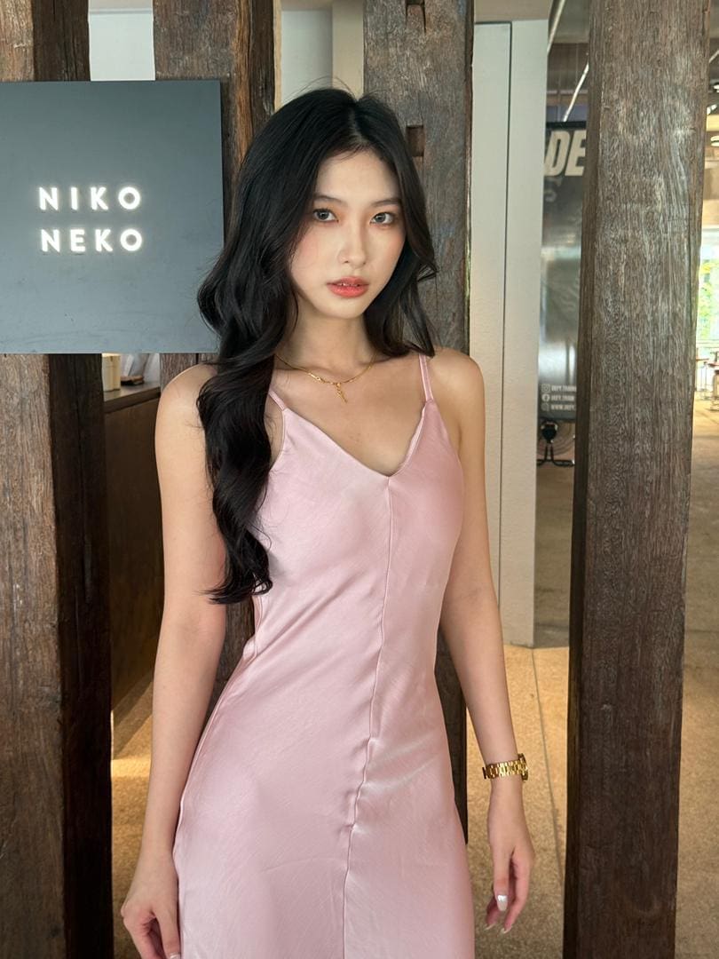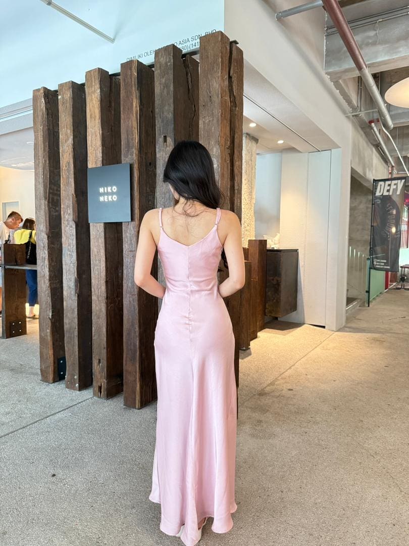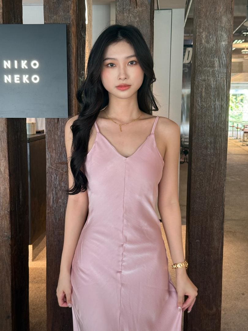 Made of Satin fabric, opening zipper at side, adjustable shoulder strap, bodycon silhouette