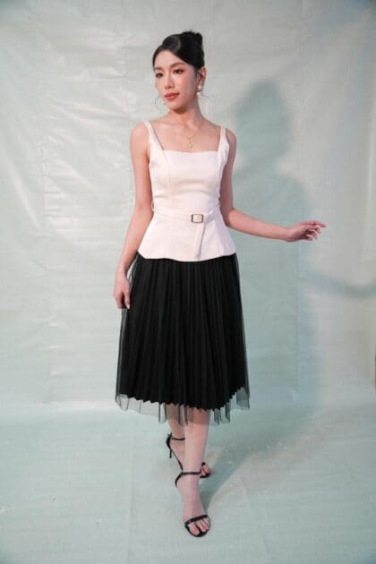 Made of Poly Cotton fabric, overlay with netting fabric, invisible zipper at centre back, elastic waistband, pleated design