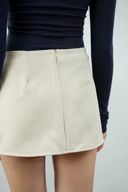 Made of polyester blend fabric, featuring slit design at side front, inner shorts provided, zipper opening at back