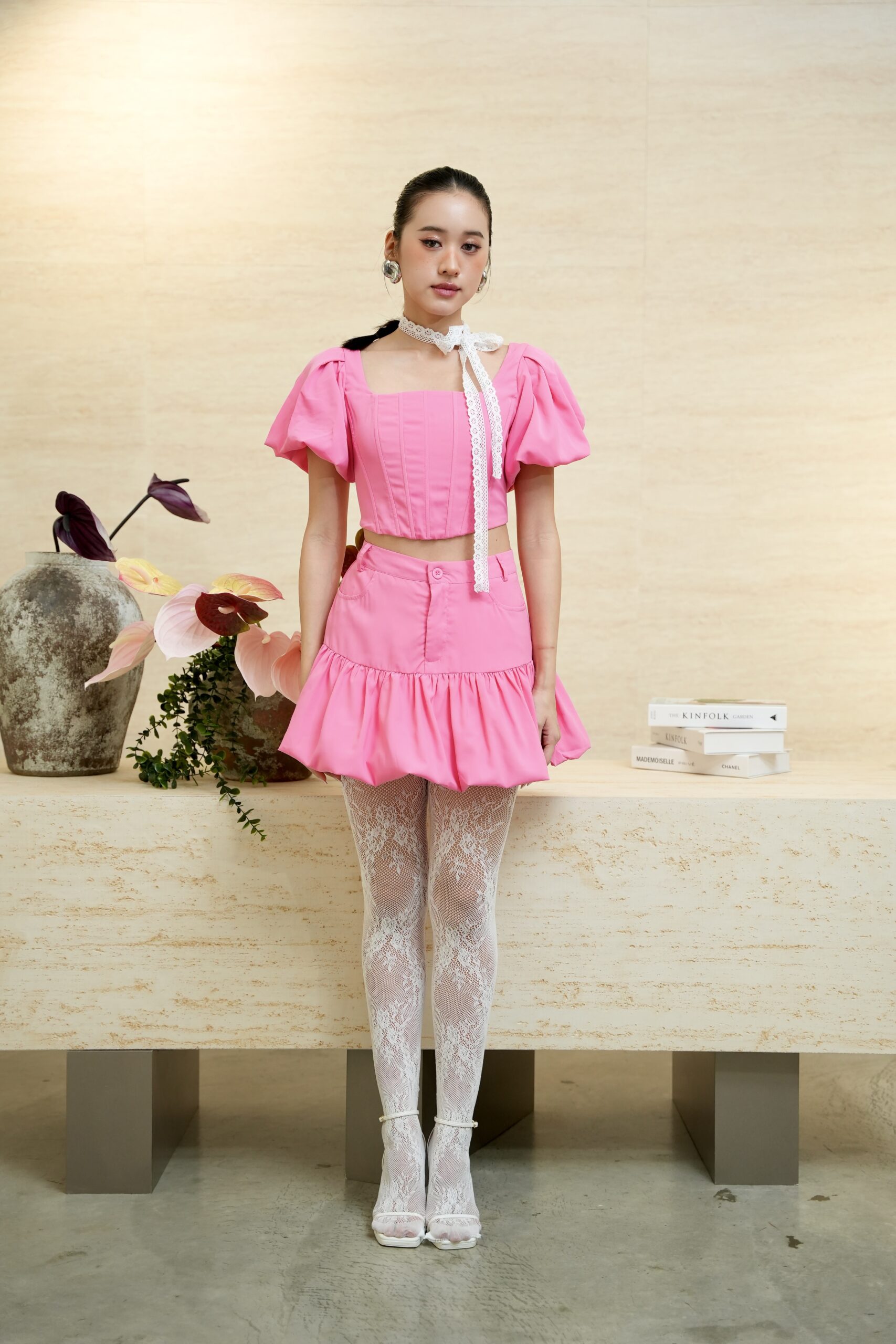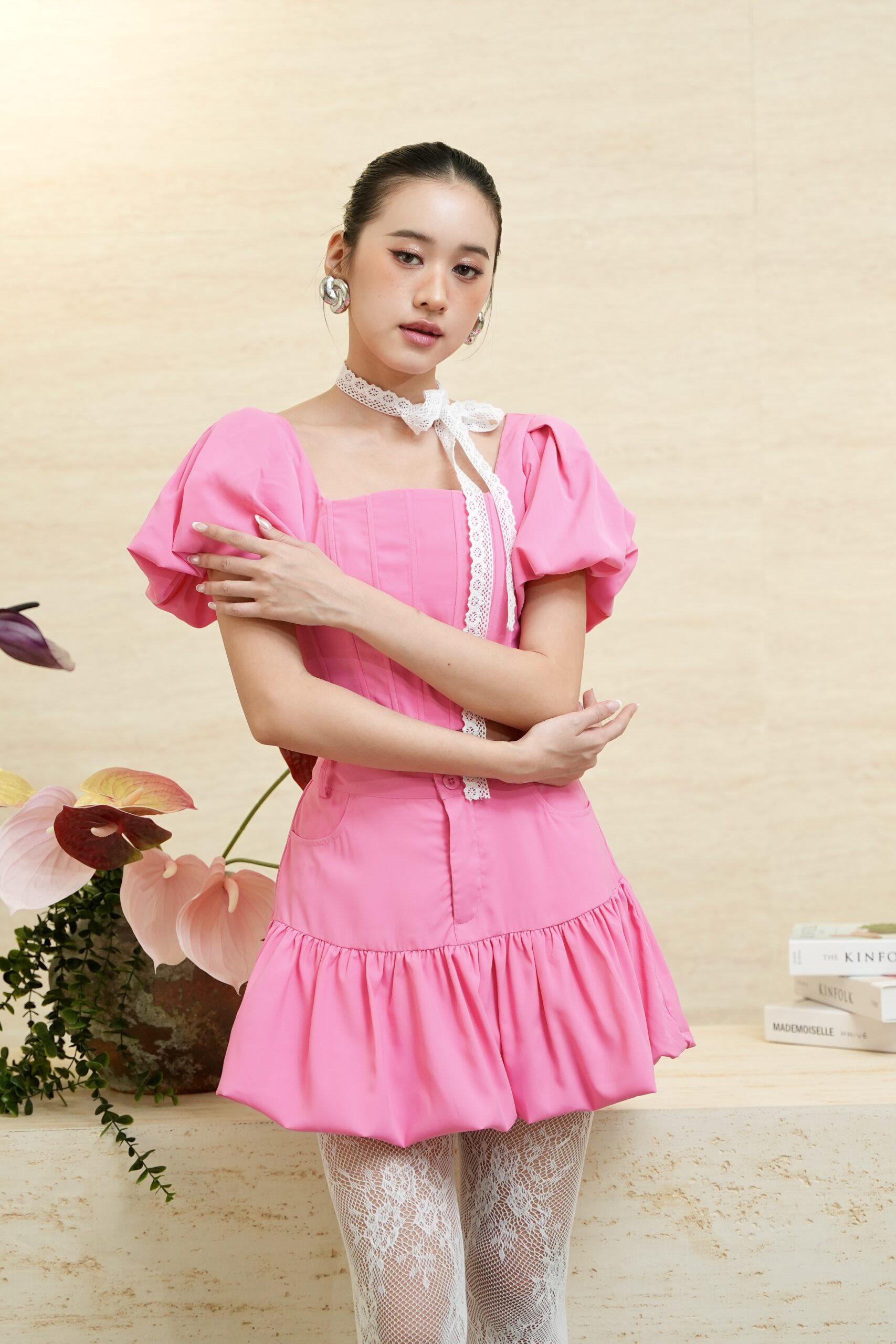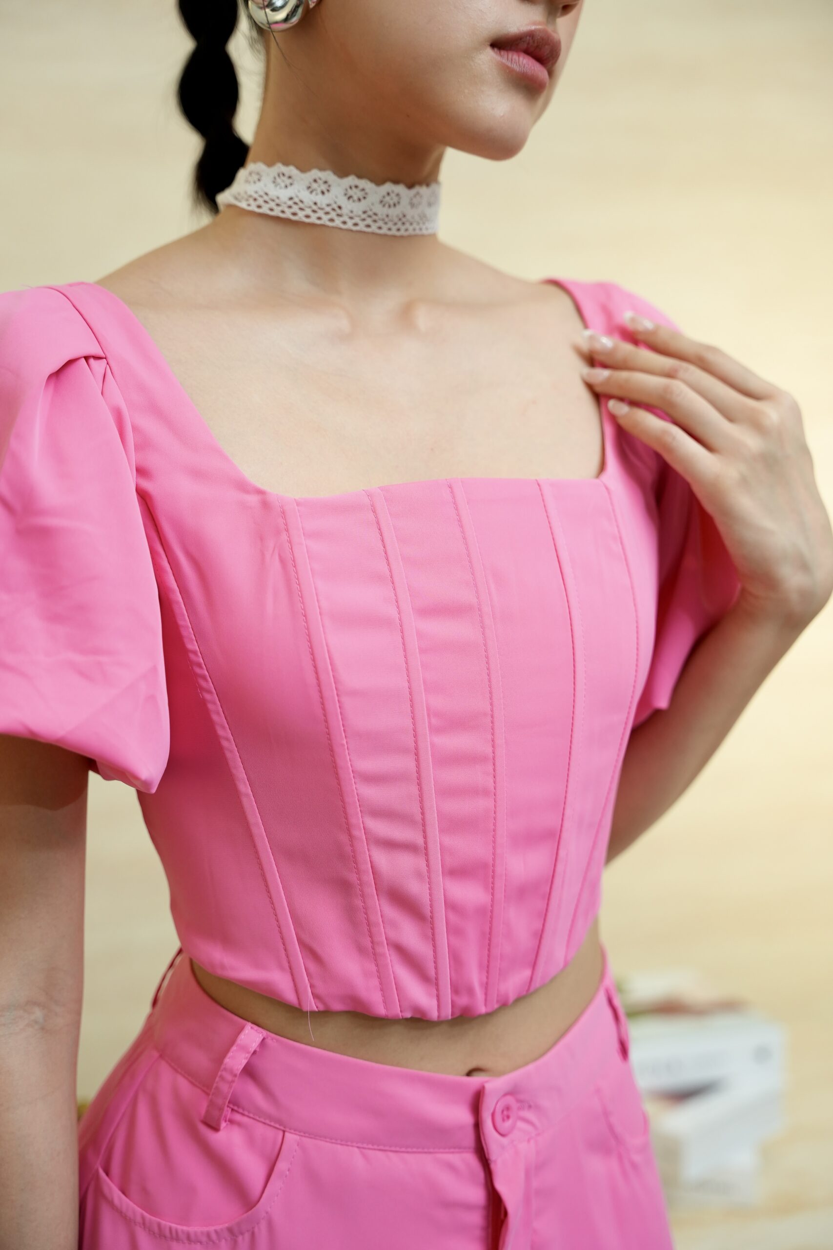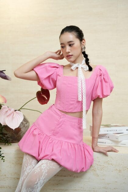Made of poly cotton fabric , opening zipper at centre back, corset design at front, puff sleeve design