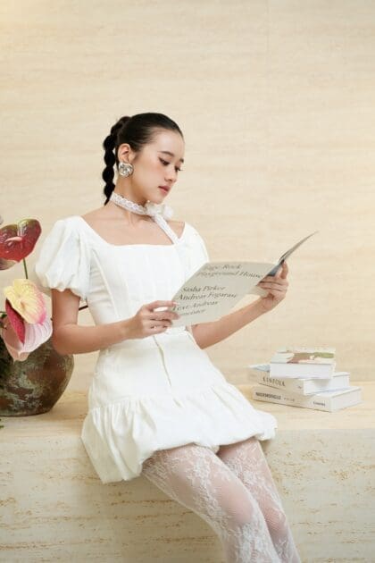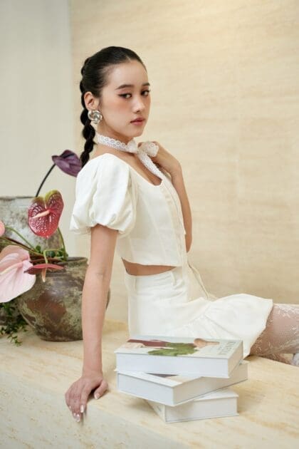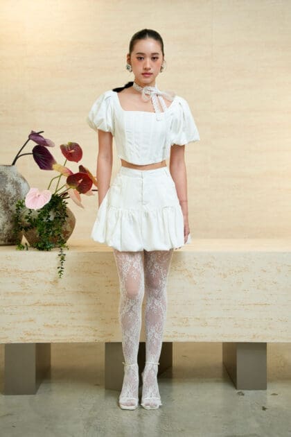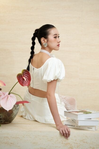 Made of poly cotton fabric , opening zipper at centre back, corset design at front, puff sleeve design