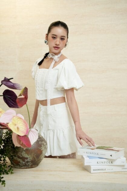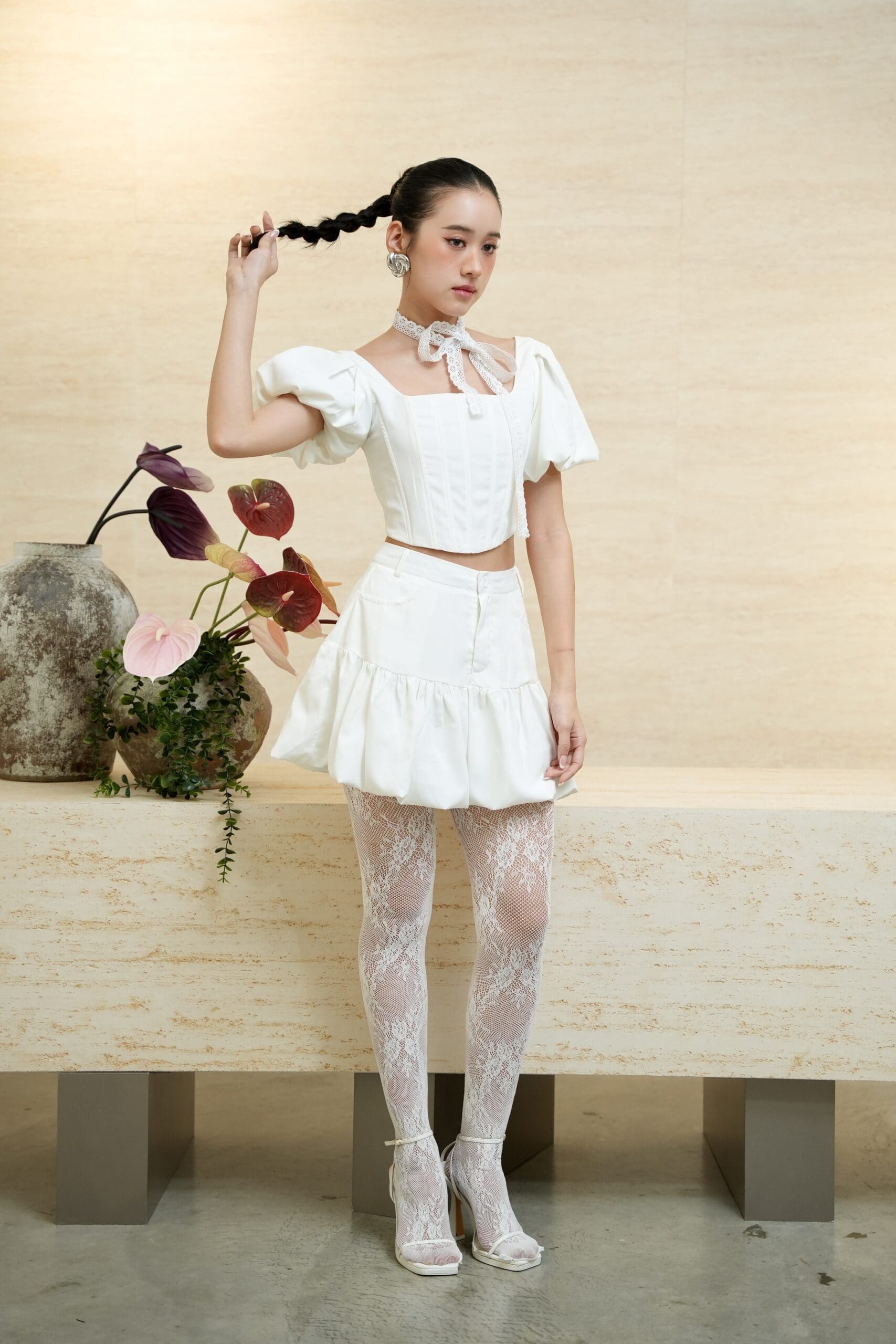 Made of poly cotton fabric , opening zipper at centre back, corset design at front, puff sleeve design