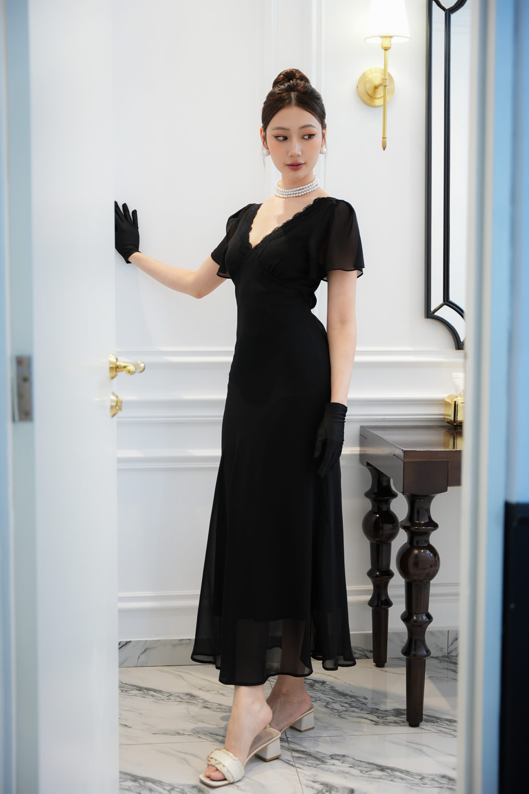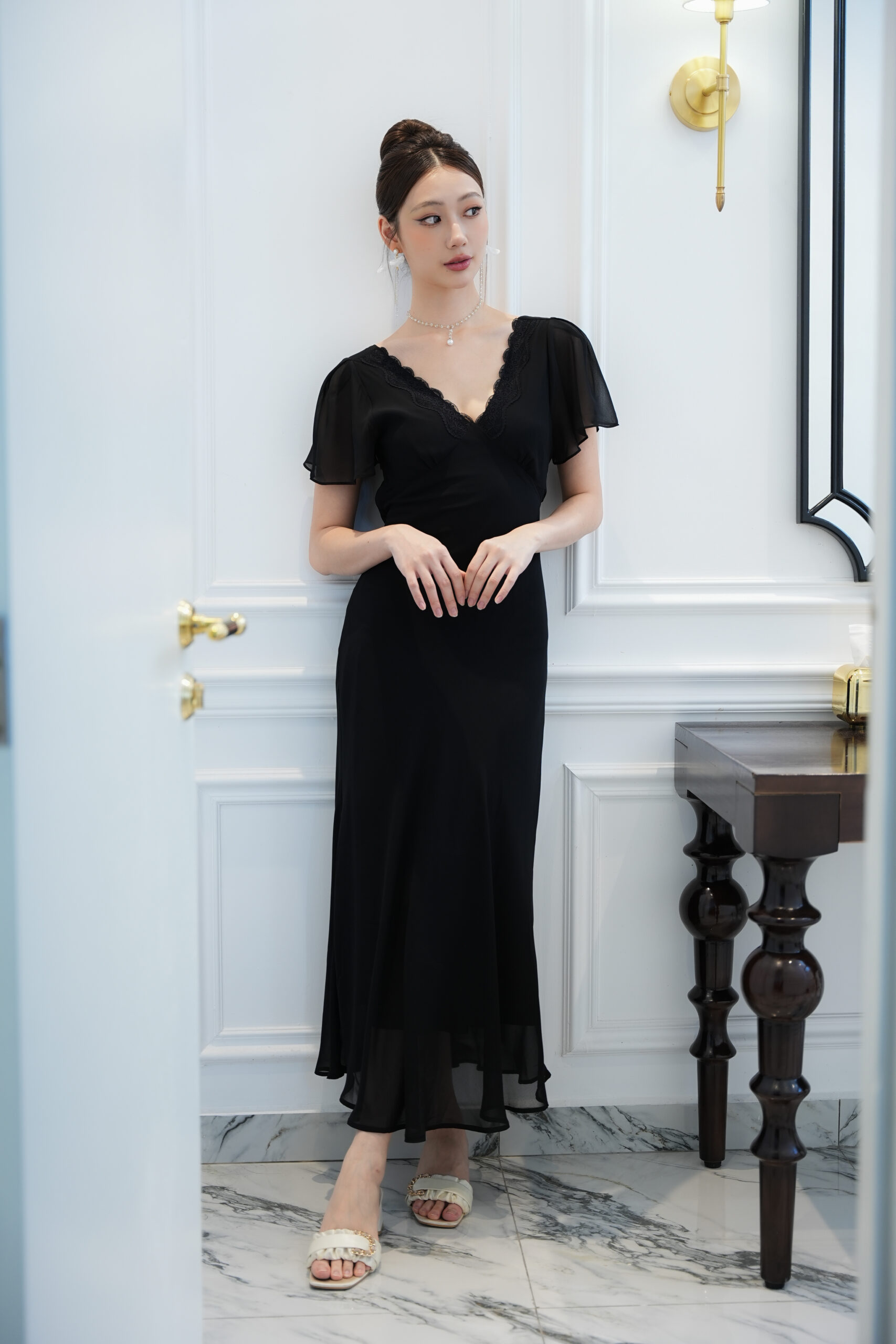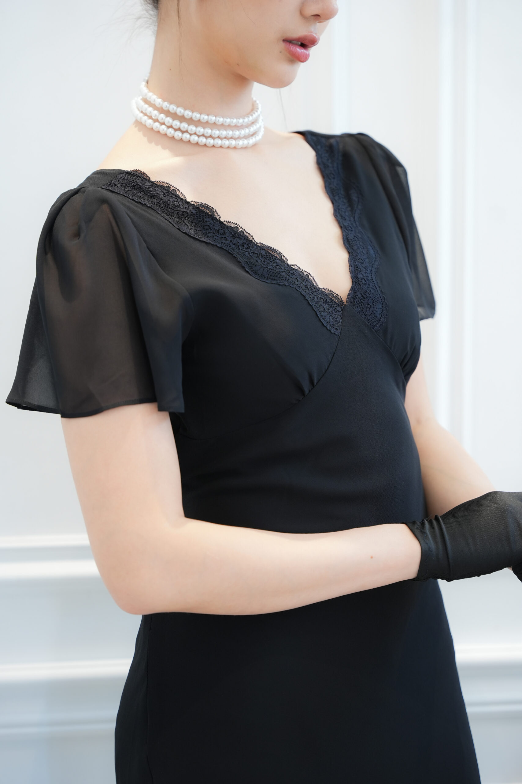 Made of chiffon fabric, lace detaling at neckline, no bust padding, waist straps provided, back invisible zipper