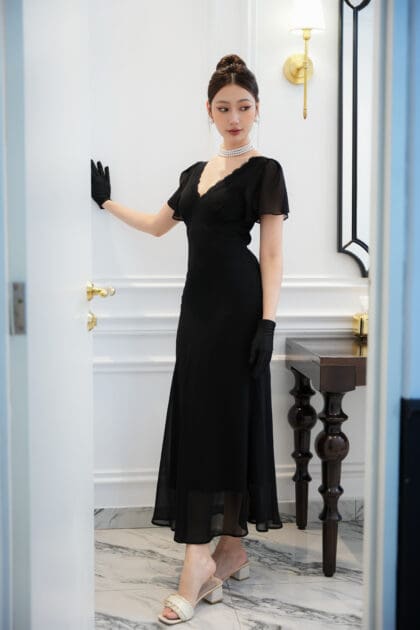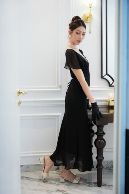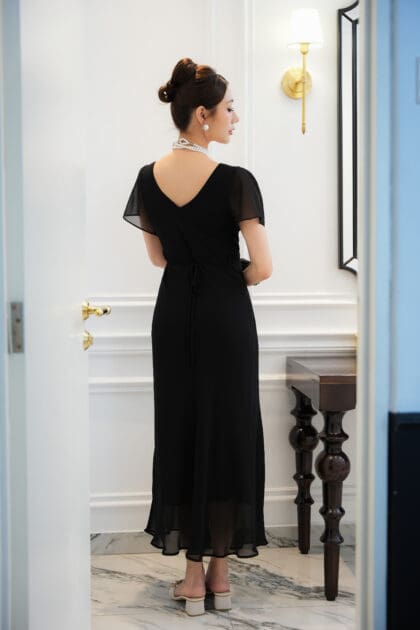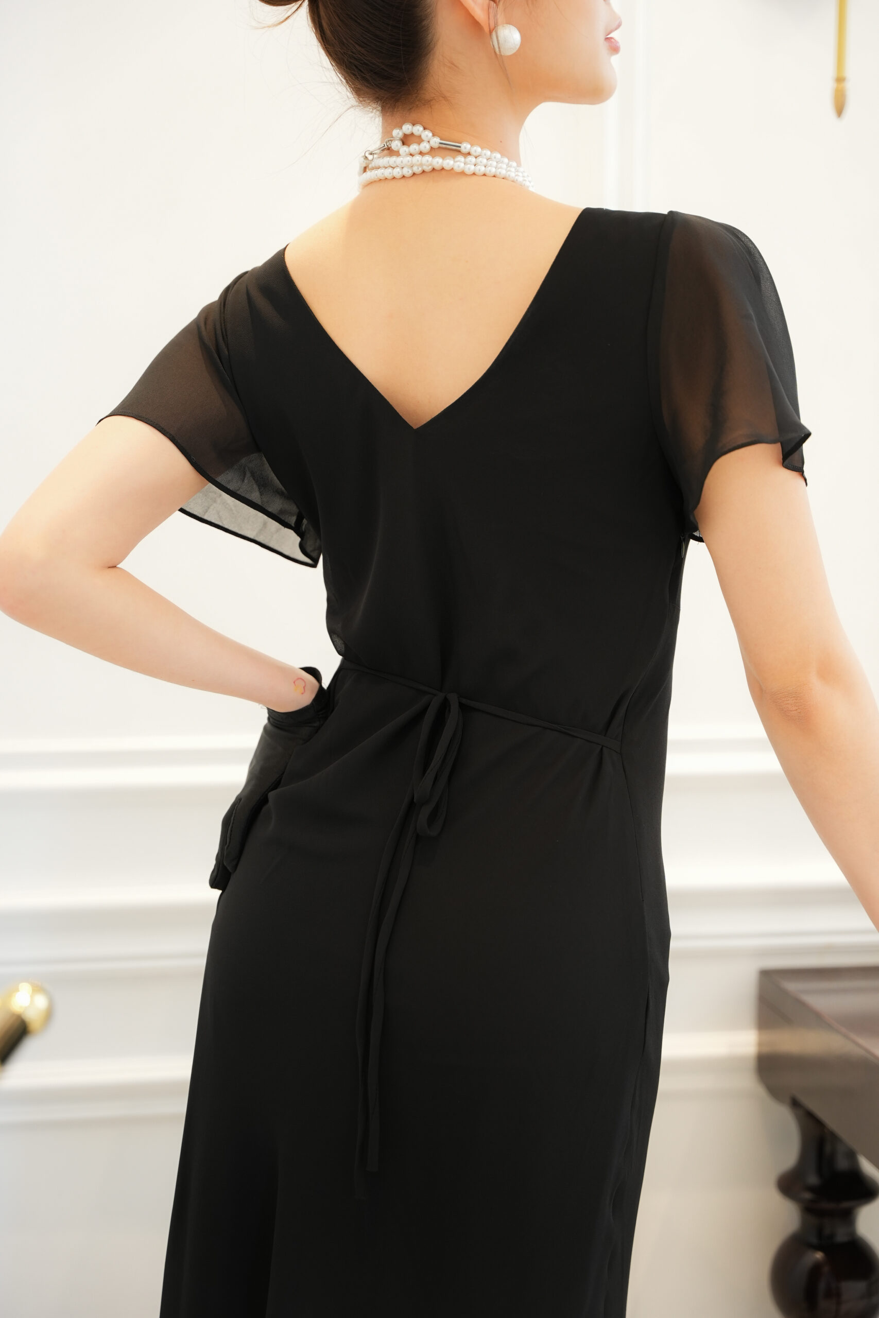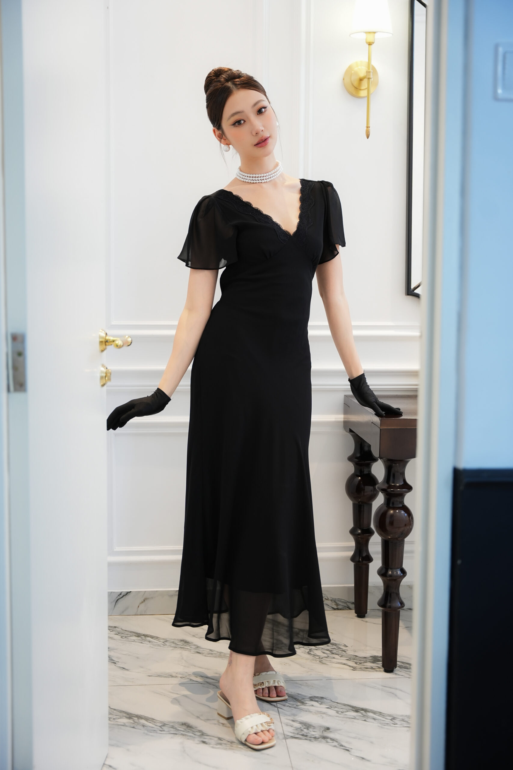 Made of chiffon fabric, lace detaling at neckline, no bust padding, waist straps provided, back invisible zipper