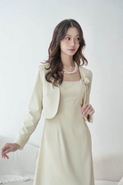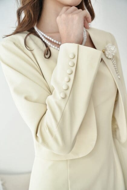 Made of cotton, Buttonless opening at front, Full shank button at both sleeve cuff area, Crop blazer design, Shoulder pad inside, Lining inside