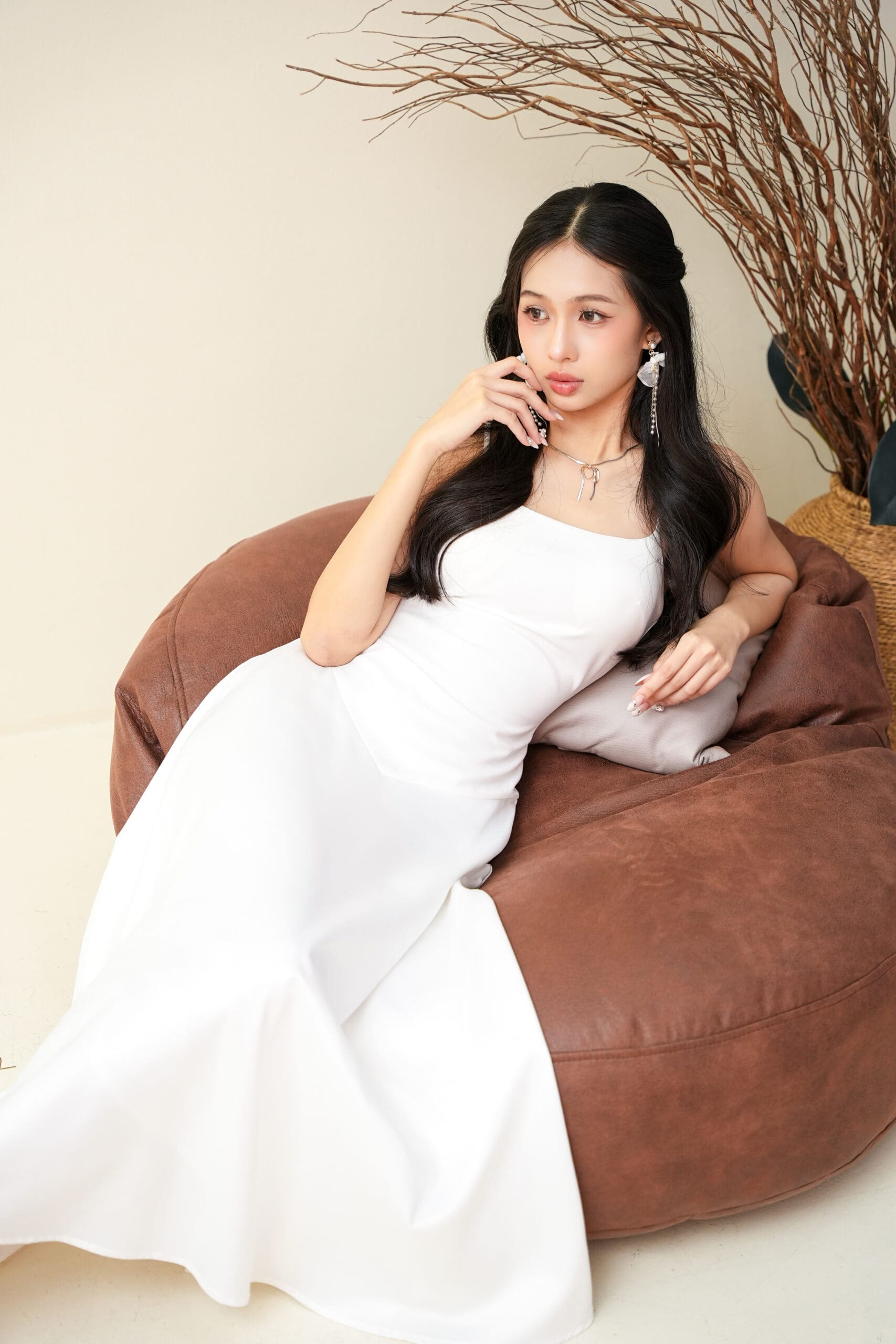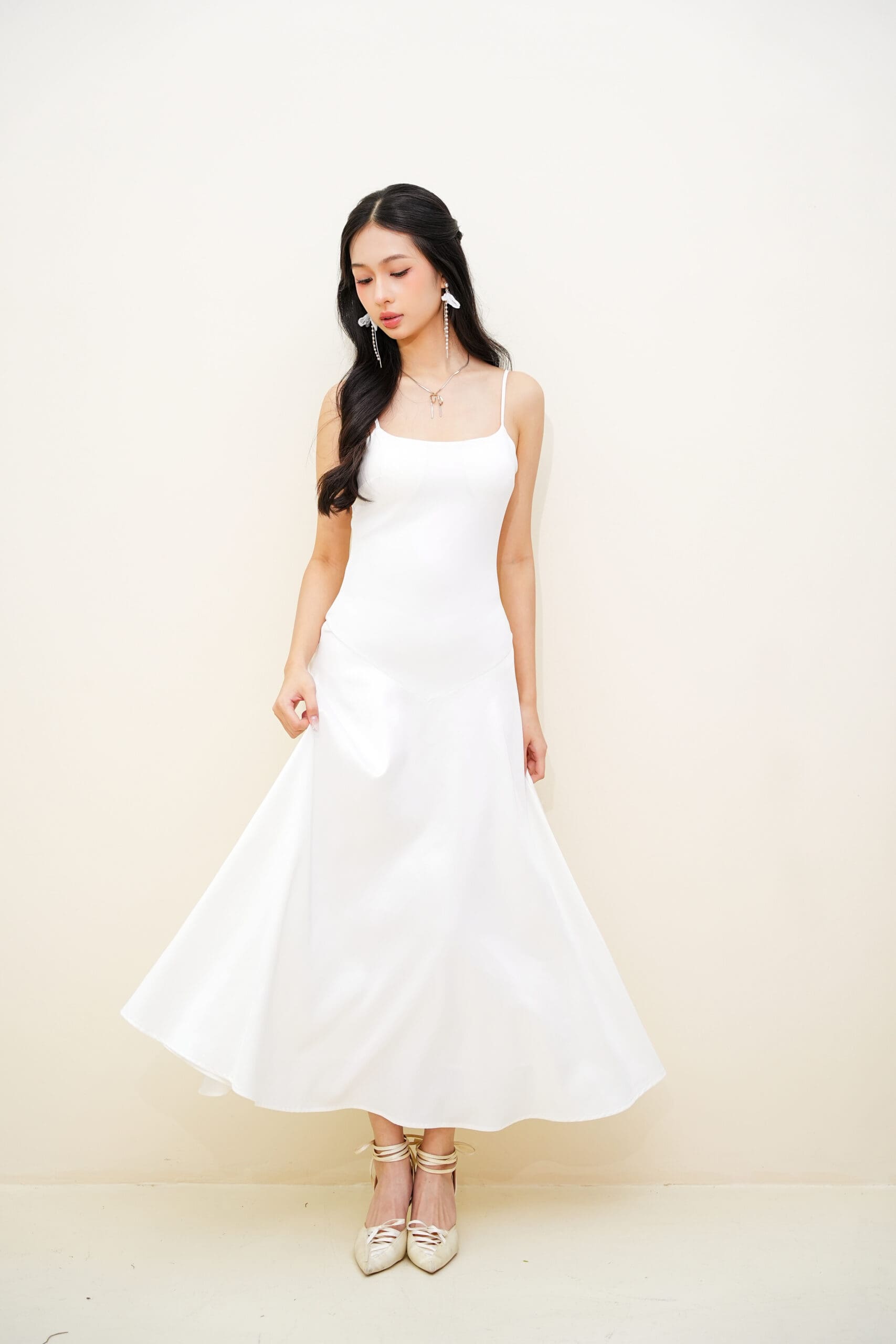 Made of Jersey and satin fabric, Stretchable at upper body, Padded, Invisible zipper at back, Adjustable strap, Low Basque waistline design, Lining inside