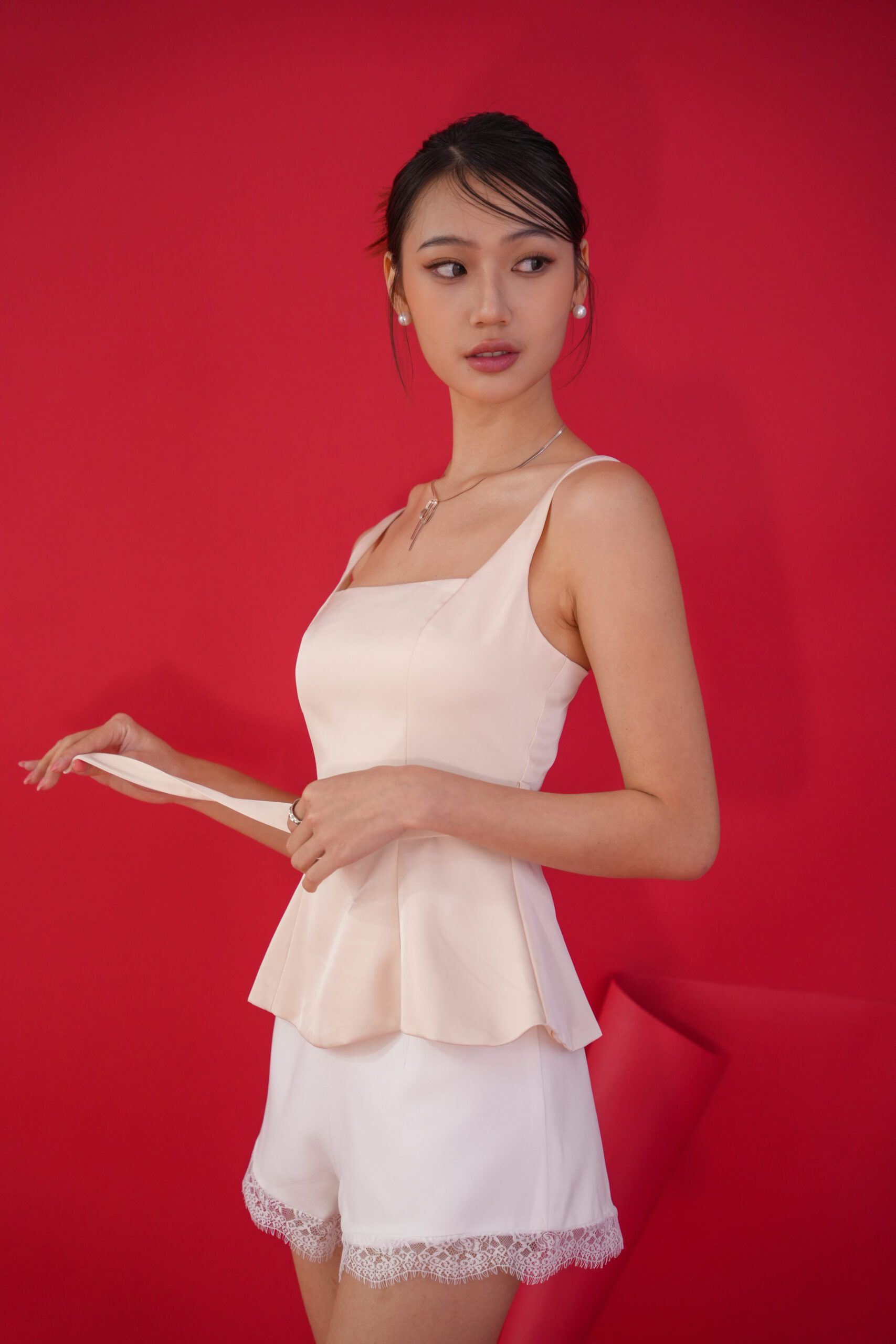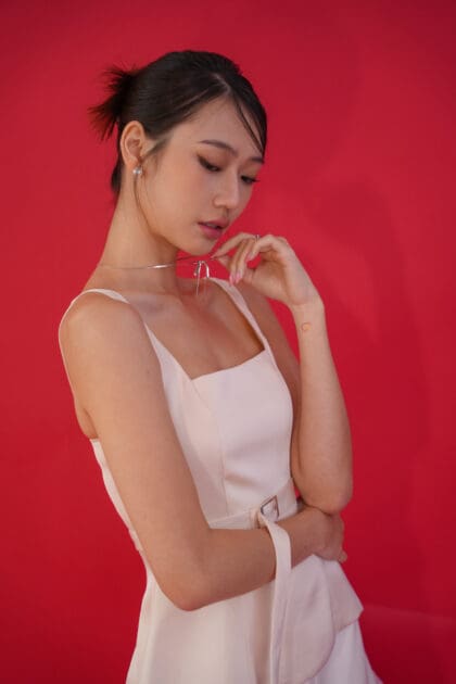 Made of satin, Invisible zip at back, No padding, Belt loops at side, Waistband with metal buckle design, Nonadjustable strap, Flare design top