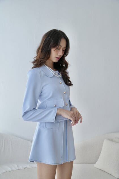Made of cotton, Button opening at front, Patch with flap pocket design at front, Peter Pan collar design, Black sewing top stitching design, Lining inside