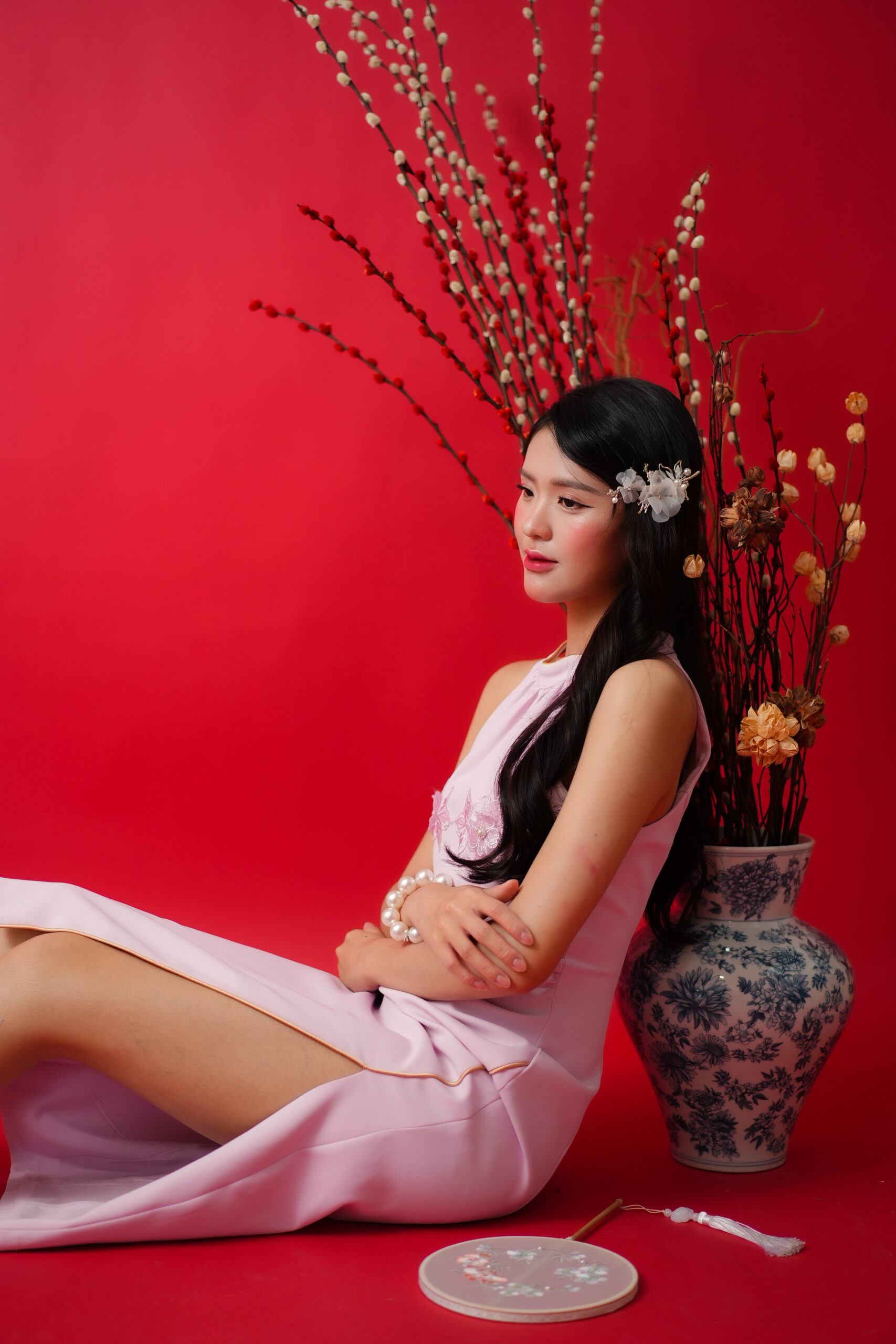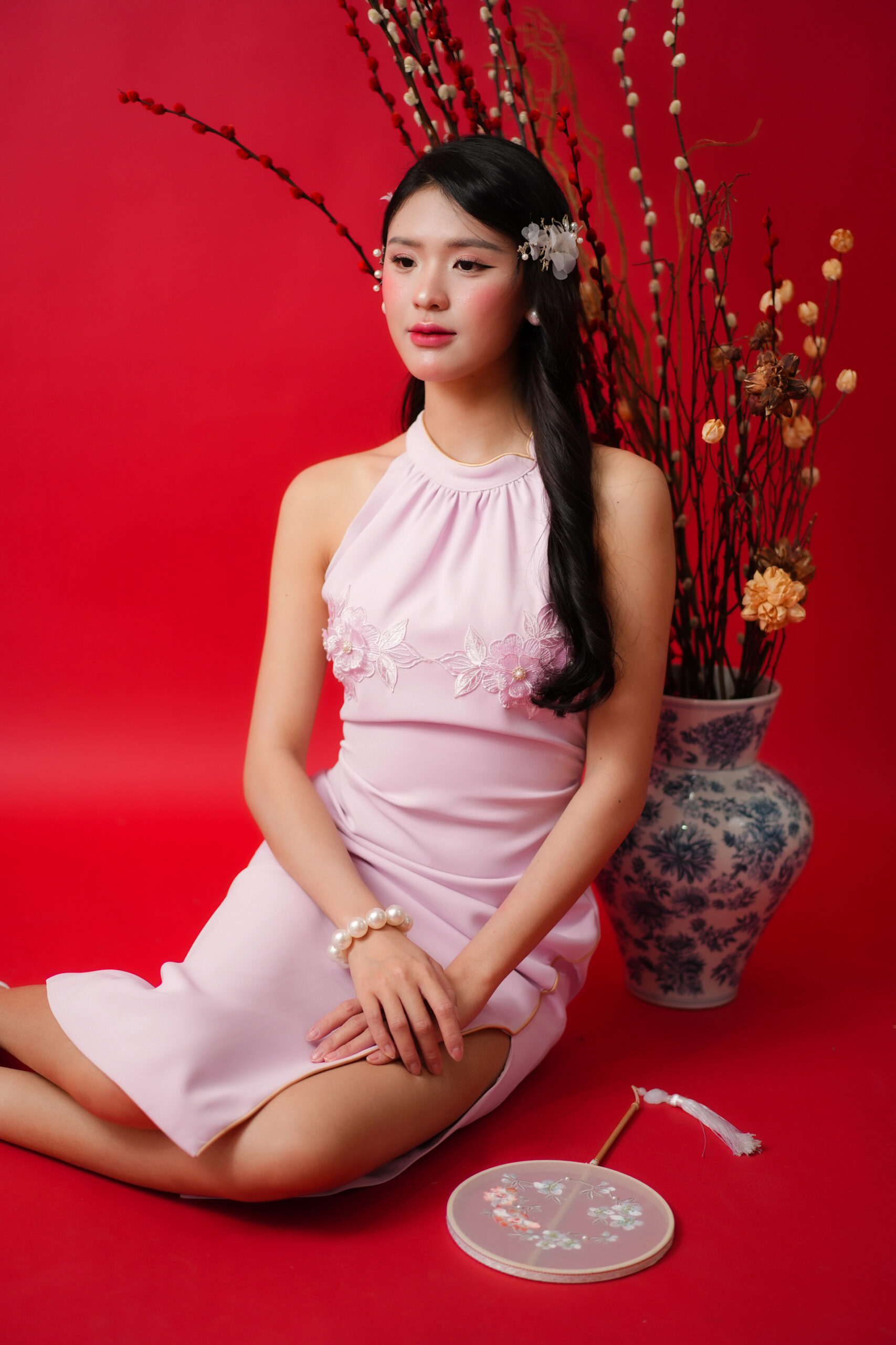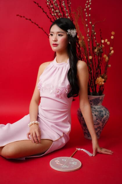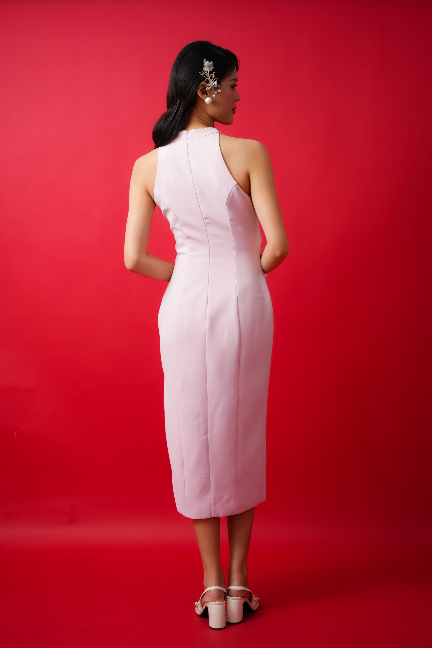 Made of polyester blend, features halter neckline, two large flower patchwork located at bust area, featuring front slit, bust padding and inner lining provided, invisible zipper at back