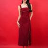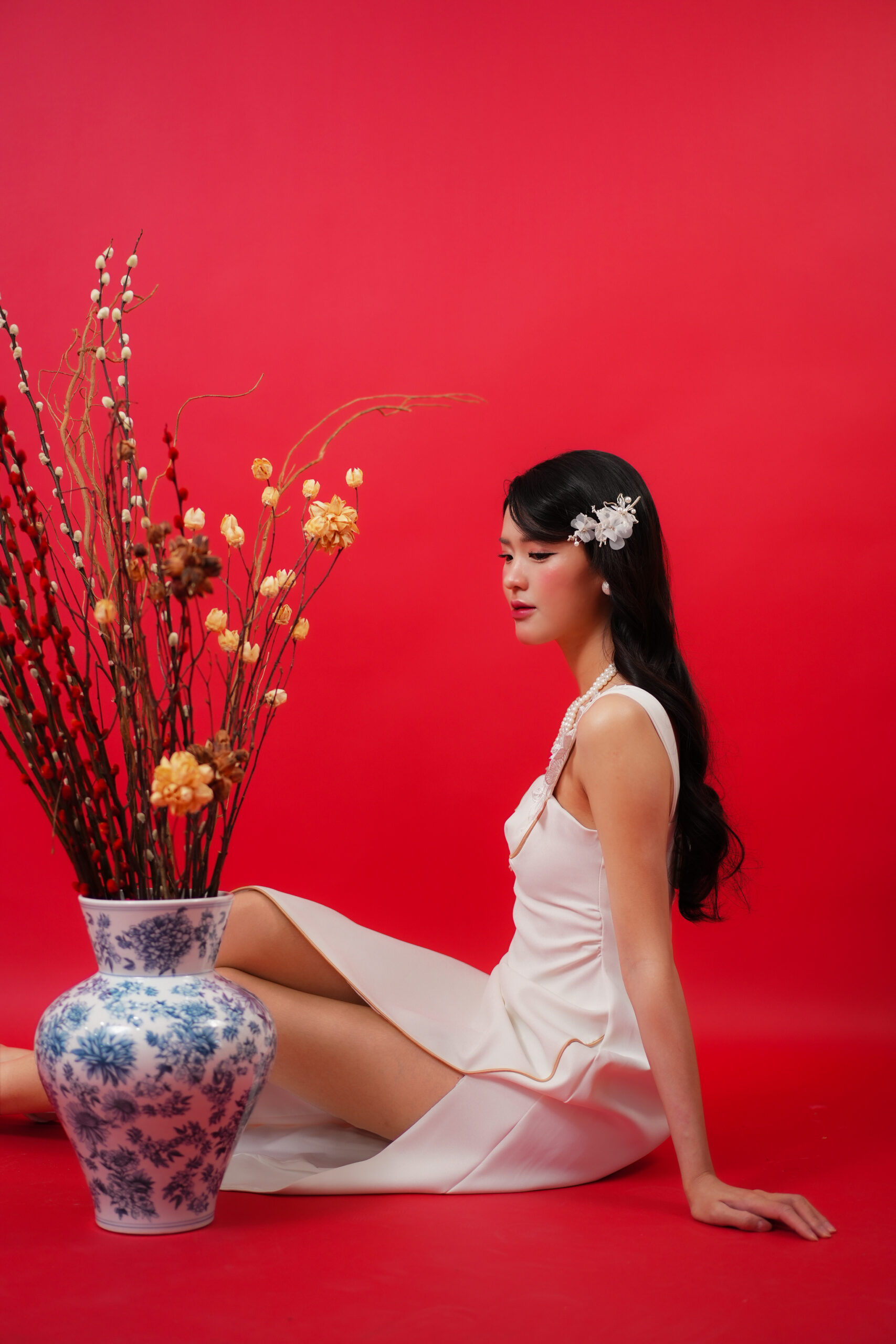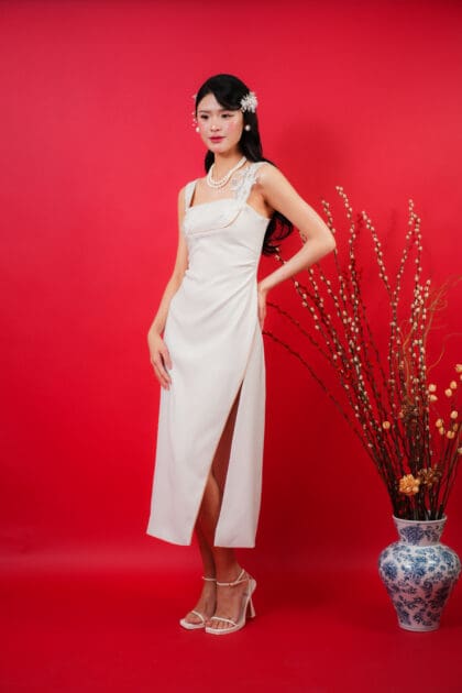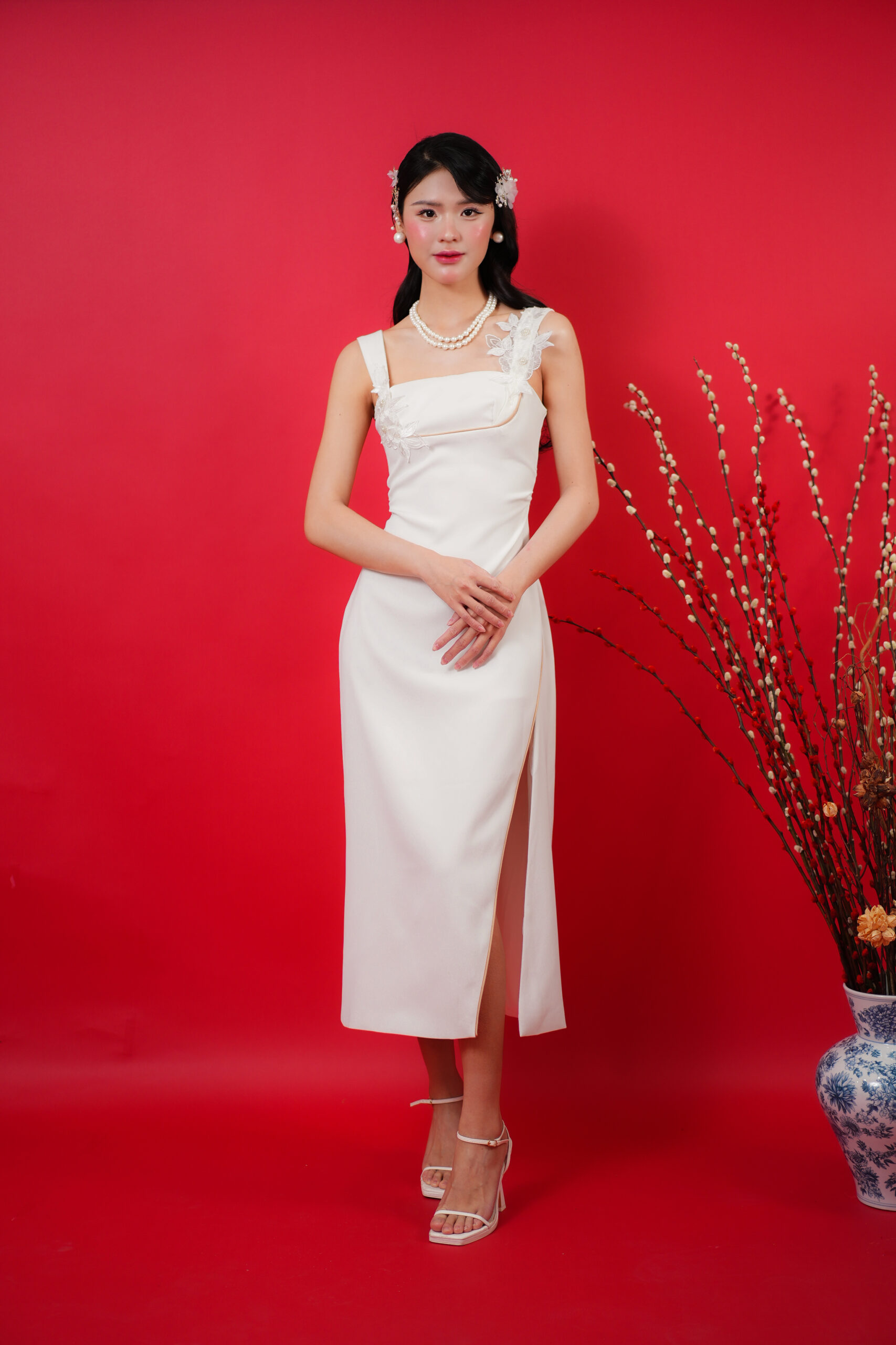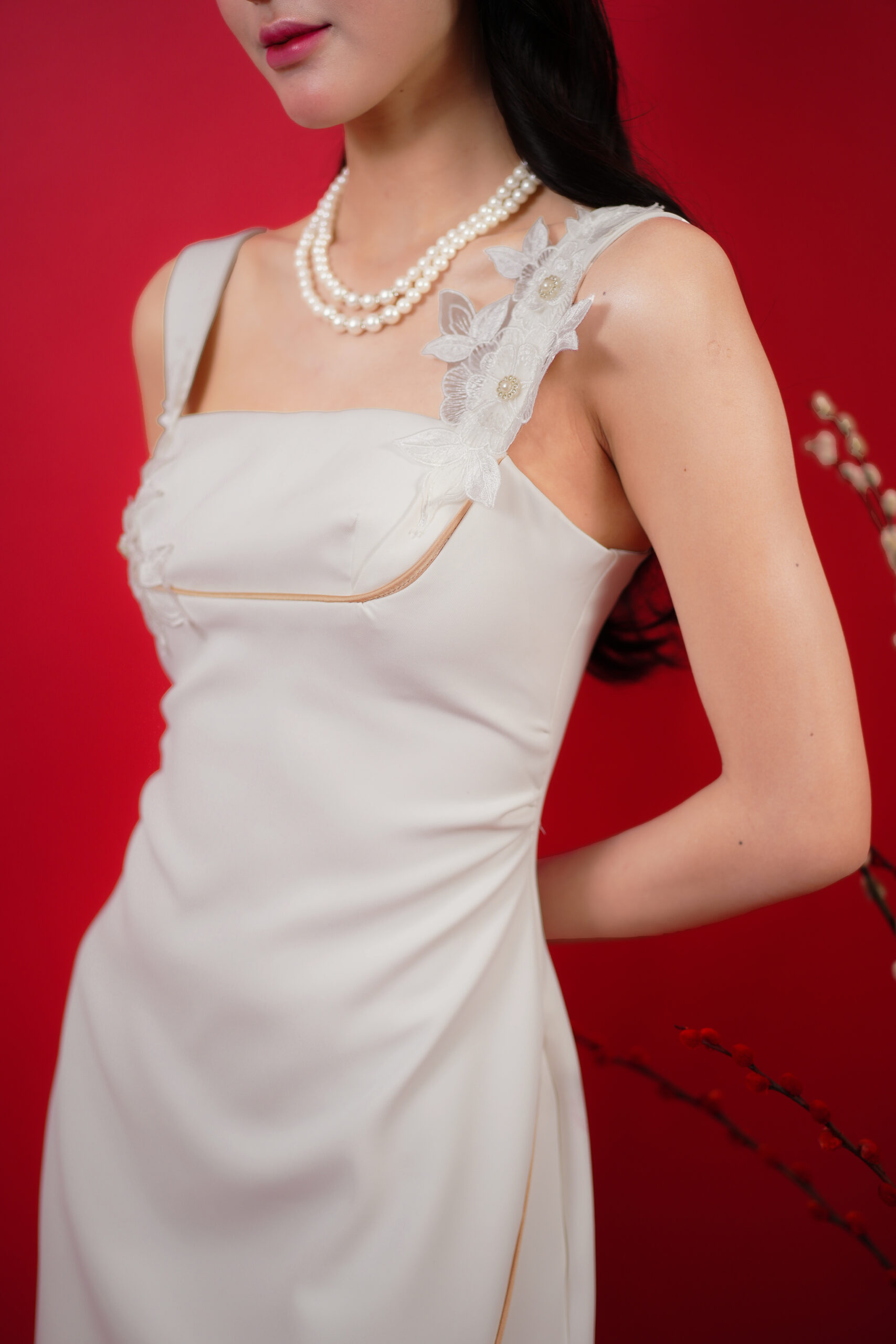 Made of polyester blend, features two large flower patchwork located at bust area and shoulder strap, featuring front slit, bust padding and inner lining provided, invisible zipper at back