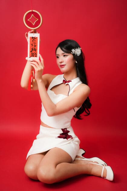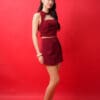 Made of polyester blend, featuring drape piece design at front with decorative flower patchwork at top-right, safety shorts provided, invisible zipper at back