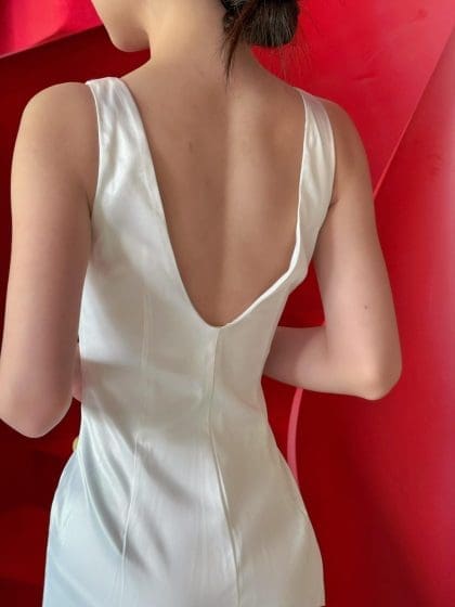 Made of satin, Stretchable, Non adjustable strap, invisible zip at side, No padding, V-neckline design, Slit opening at