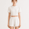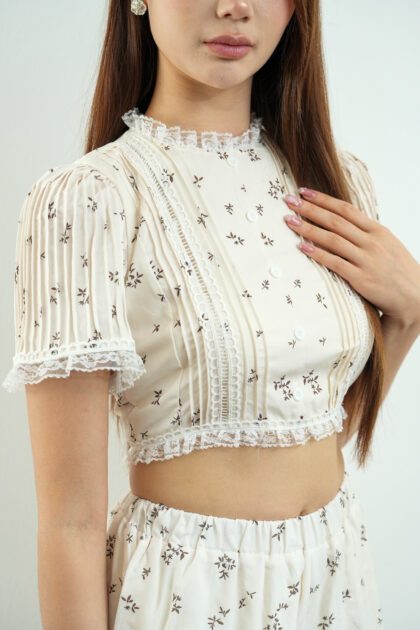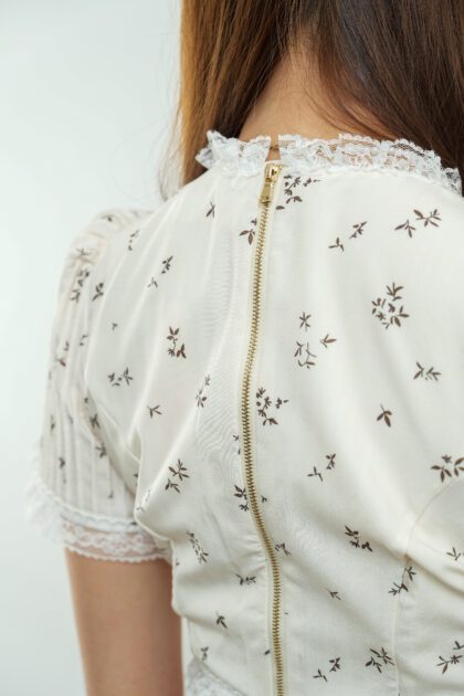 Made of cotton blend fabric, ruffles lace design at collar and hem, decorative buttons at front, pintucks design at sleeve and front , opening zipper at back
