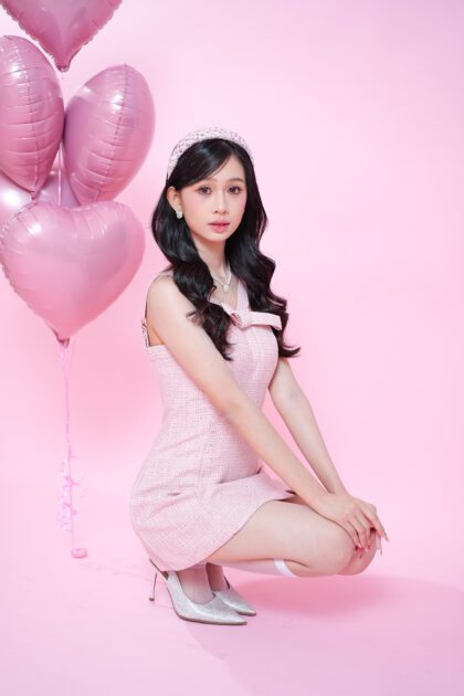 Made of Tweed fabric, featuring ribbon bow at front bust and a slight slit cut at front, bust padding provided, providing adjustable shoulder stripe and zipper opening at back