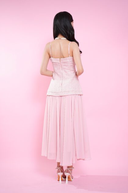 Made of Tweed fabric (Upper body), Chiffon Fabric (Lower body), bust padding provided, two heart-shaped pocket at front, zipper opening at back, adjustable shoulder strap