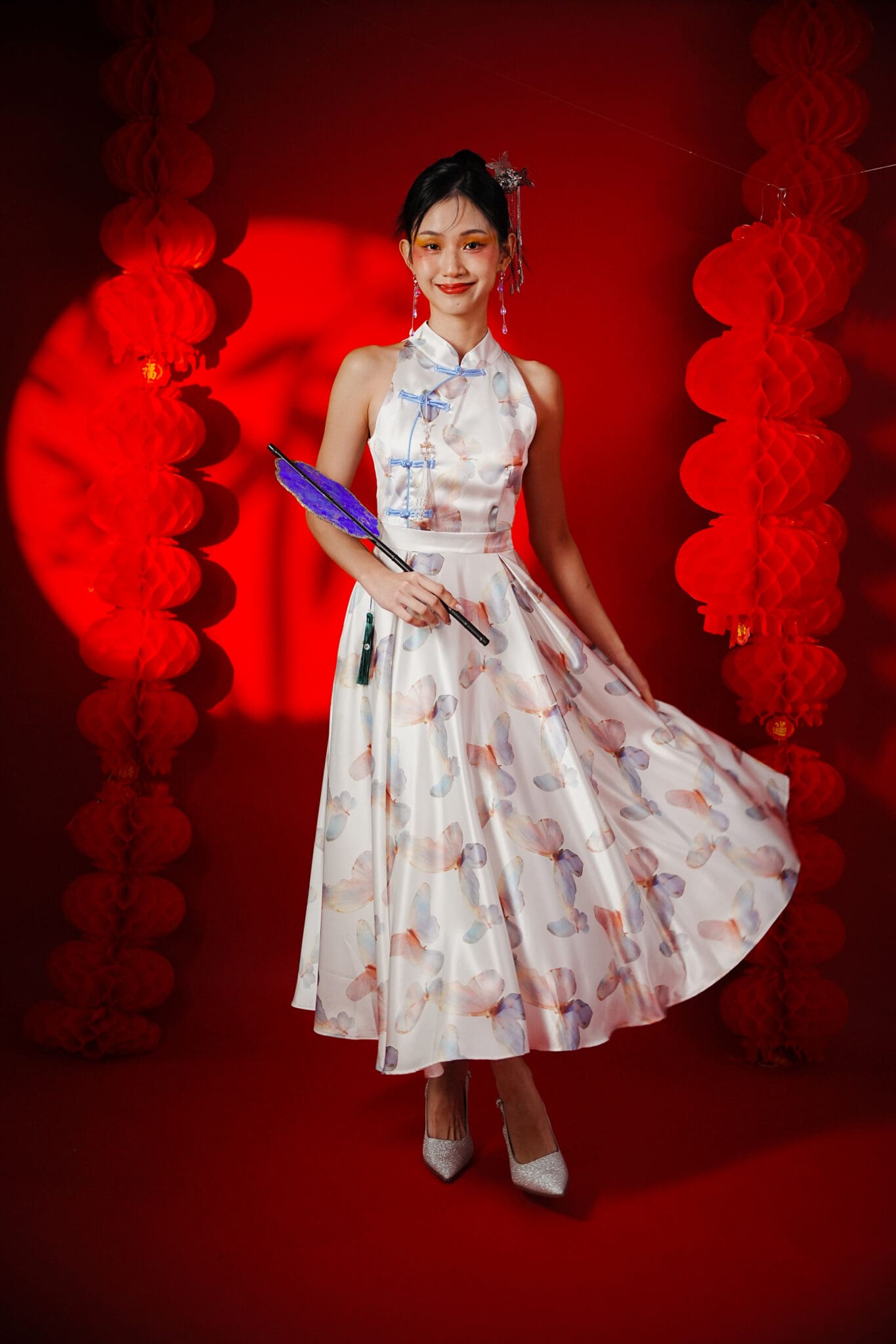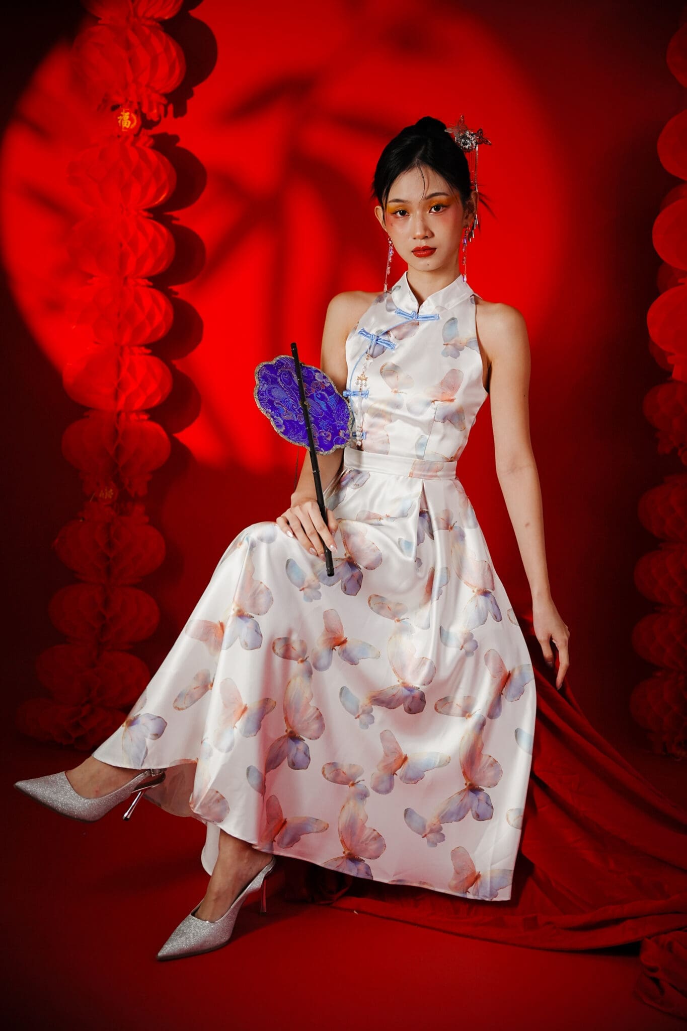 Made of satin, non-stretchable, invisible zipper at the back, No padding, Hidden pocket in the side, Chinese knot button and pipping design at the front, pleated long dress design, Lining inside.